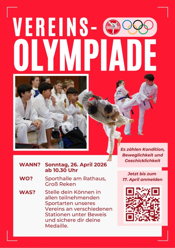 ???? Vereins-Olympiade beim Judo-Club Velen-Reken e.V.Am Sonntag, den 26.04.2026 findet unsere Vereins-Olympiade in der Sporthalle am Rathaus in Reken statt!Euch erwartet ein sportlicher Vormittag, bei dem ihr eure Fähigkeiten in Kondition, Schnelligkeit, Beweglichkeit und Kraft unter Beweis stellen könnt. Dabei zählen nicht nur Leistung, sonder auch Teamgeist, Disziplin und Einsatz. Denn Punkte werden sowohl einzeln […]