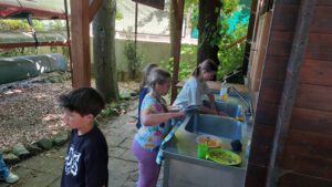 Beim Kommando „Schildkröte“ wusste jeder, dass es Zeit zum Essen fassen war. Dazu versammelten wir uns im „Lager“ (Platz zwischen 4 Hütten, wo ein Pavillon und Tische standen). André war für die Verpflegung zuständig und hat uns unterschiedlichste Gerichte gezaubert. Das Spülen der eigenen Teller gehörte mit zum Lagerleben.