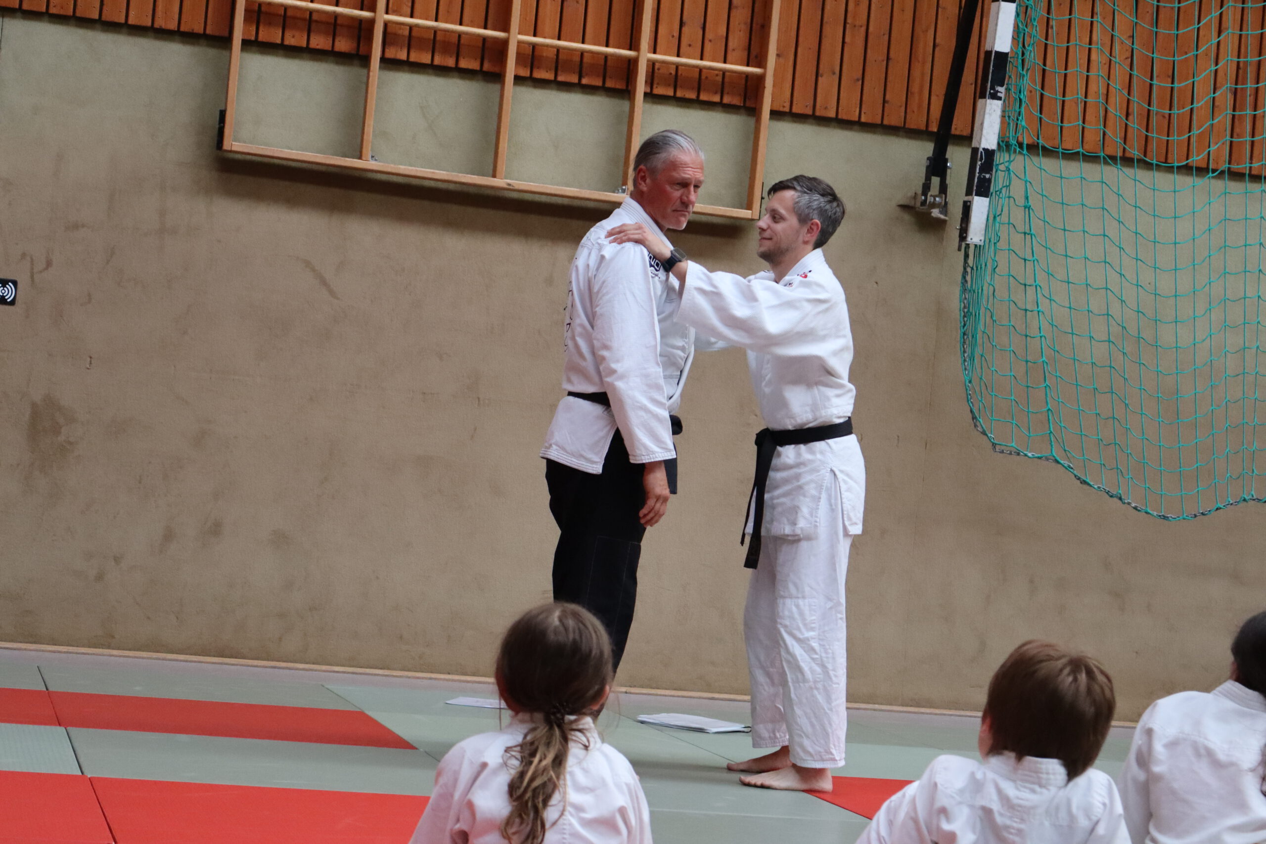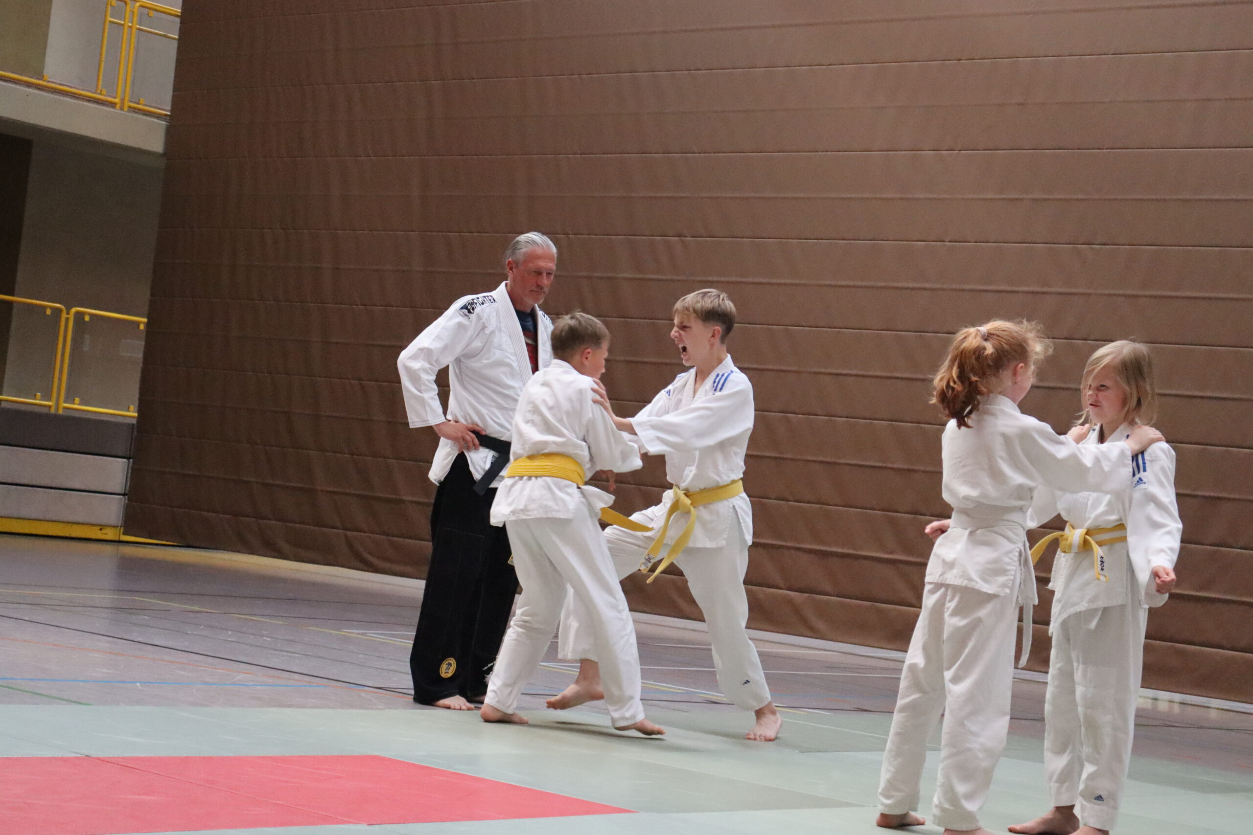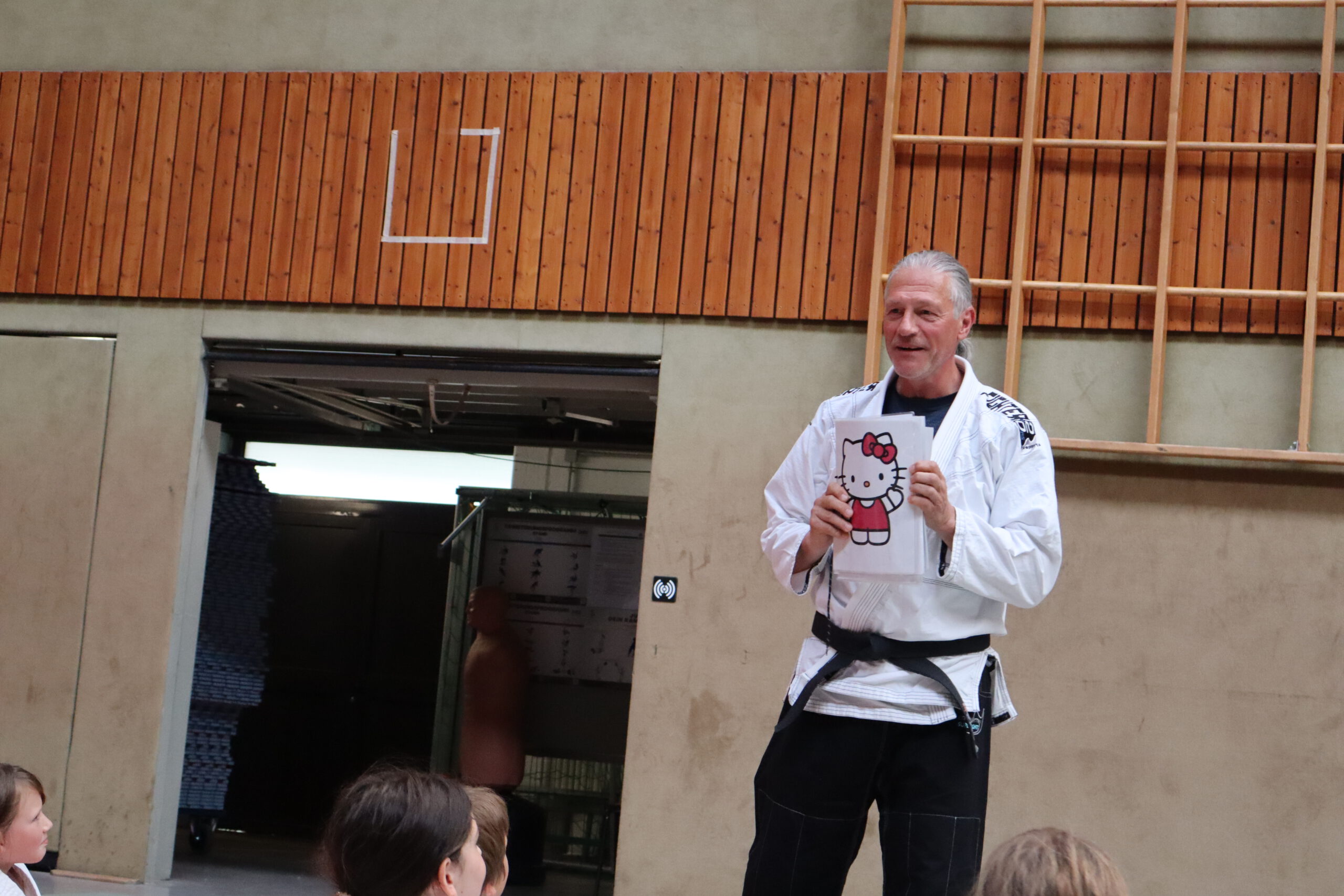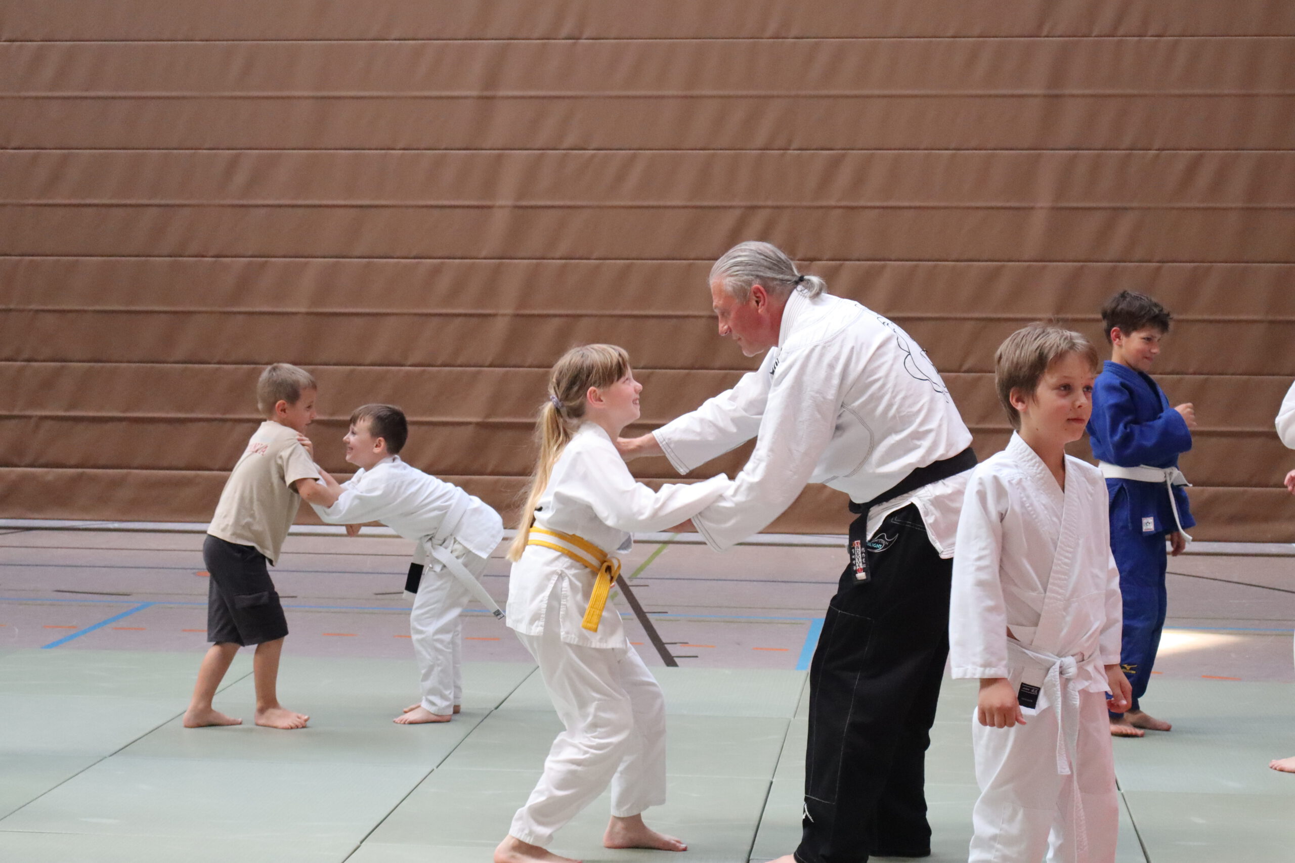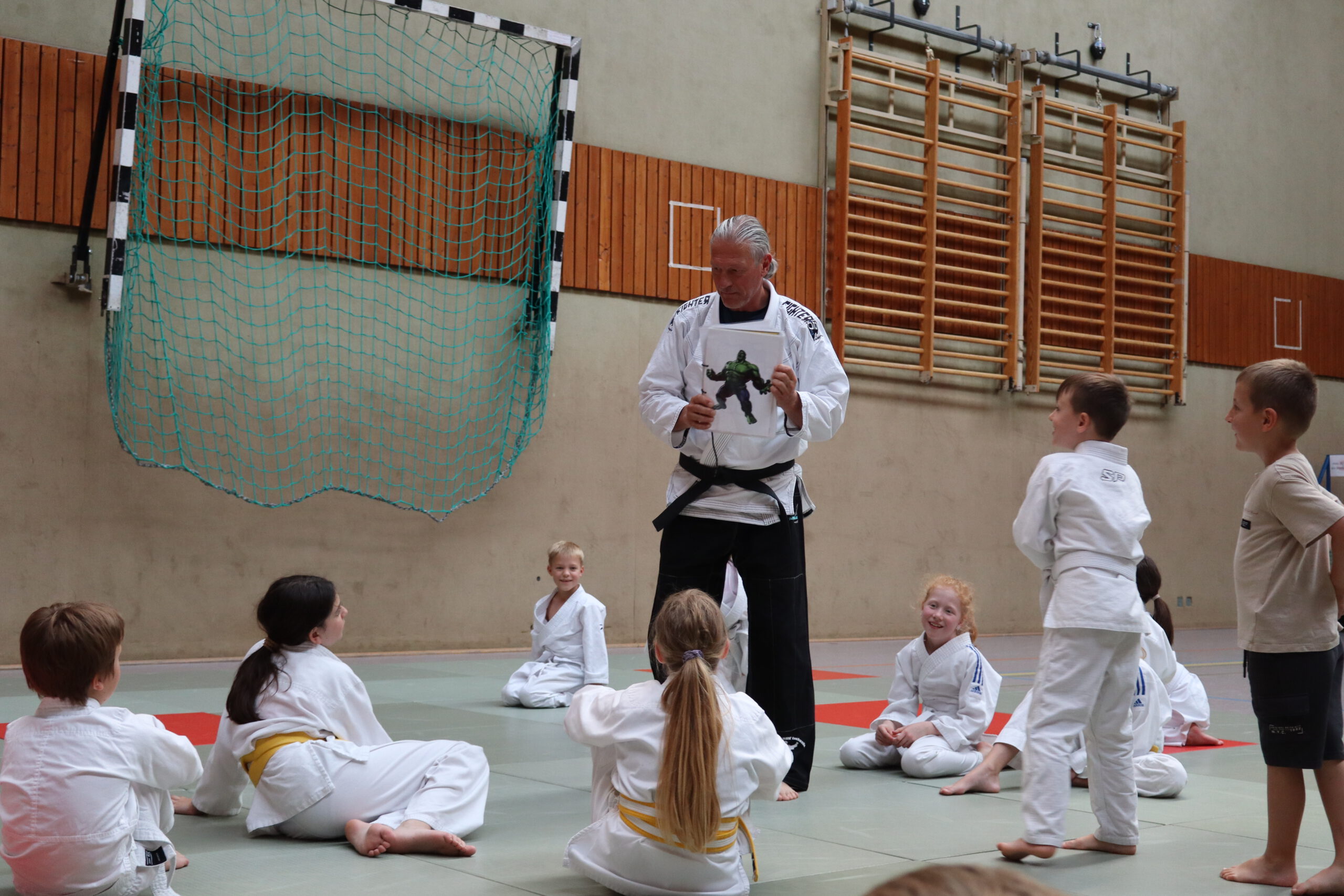Und da Andreas Dern schon mal da war, kamen auch gleich die Kinder und Jugendlichen in den Genuss, einmal einen anderen, erfahrenen Jugendtrainer live auf der Matte zu erleben. Mit viel Witz brachte er seine Begeisterung für den JuJutsu-Sport an die jungen Sportlerinnen und Sportler. Diese dankten es ihm mit viel Fleiß und leuchtenden Kinderaugen. Mit Bildern vermochte es Andreas den Kindern beizubringen, sich wie ein Superheld zu verteidigen. So lernten sie die Verteidigungstechniken der Superhelden von Hello Kitty bis zum Hulk.