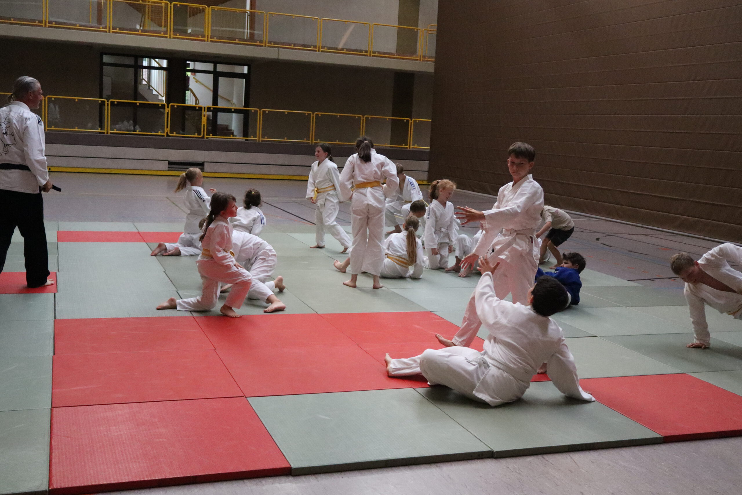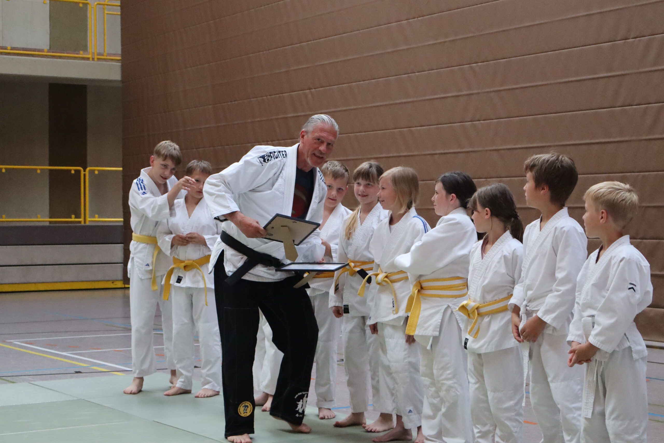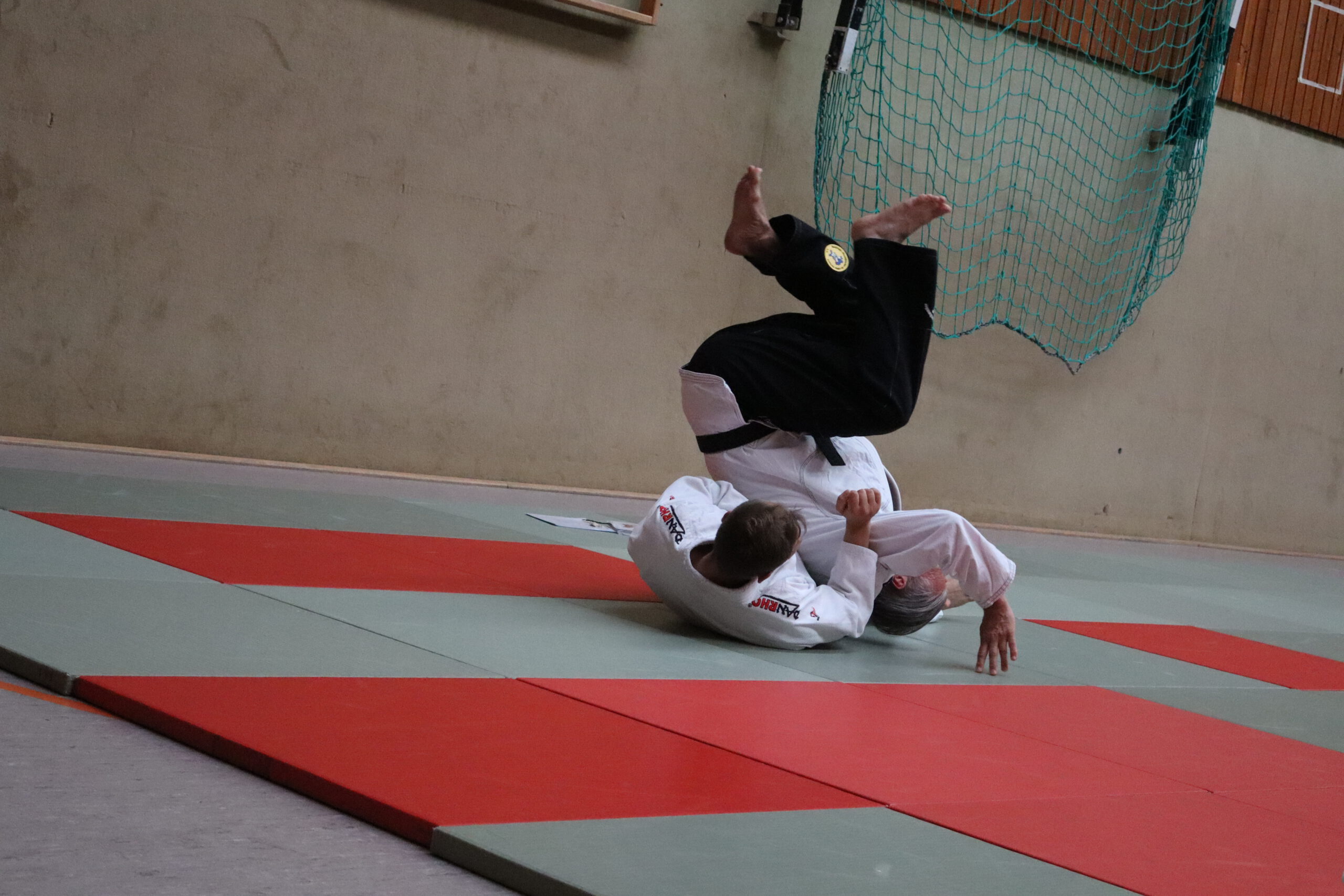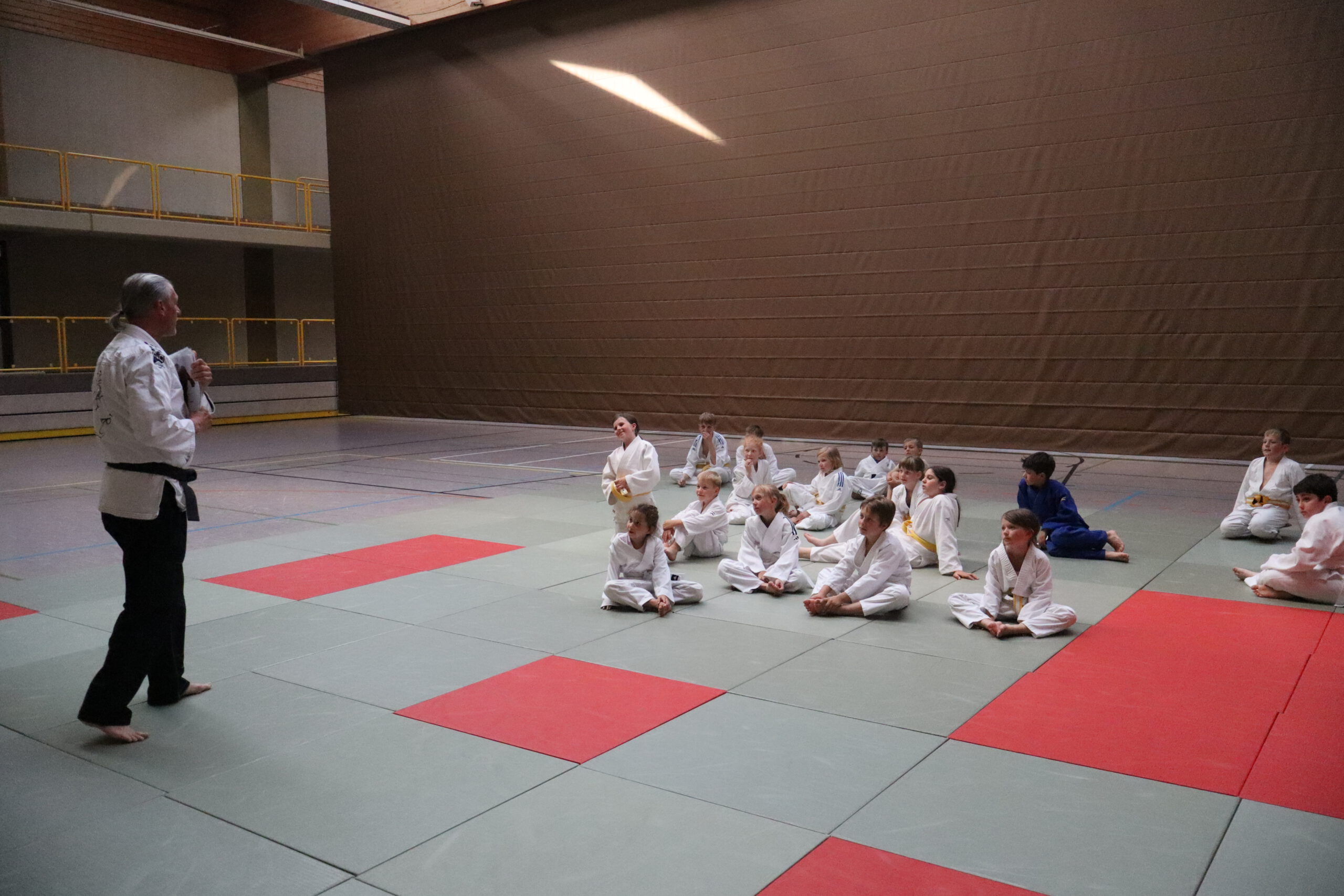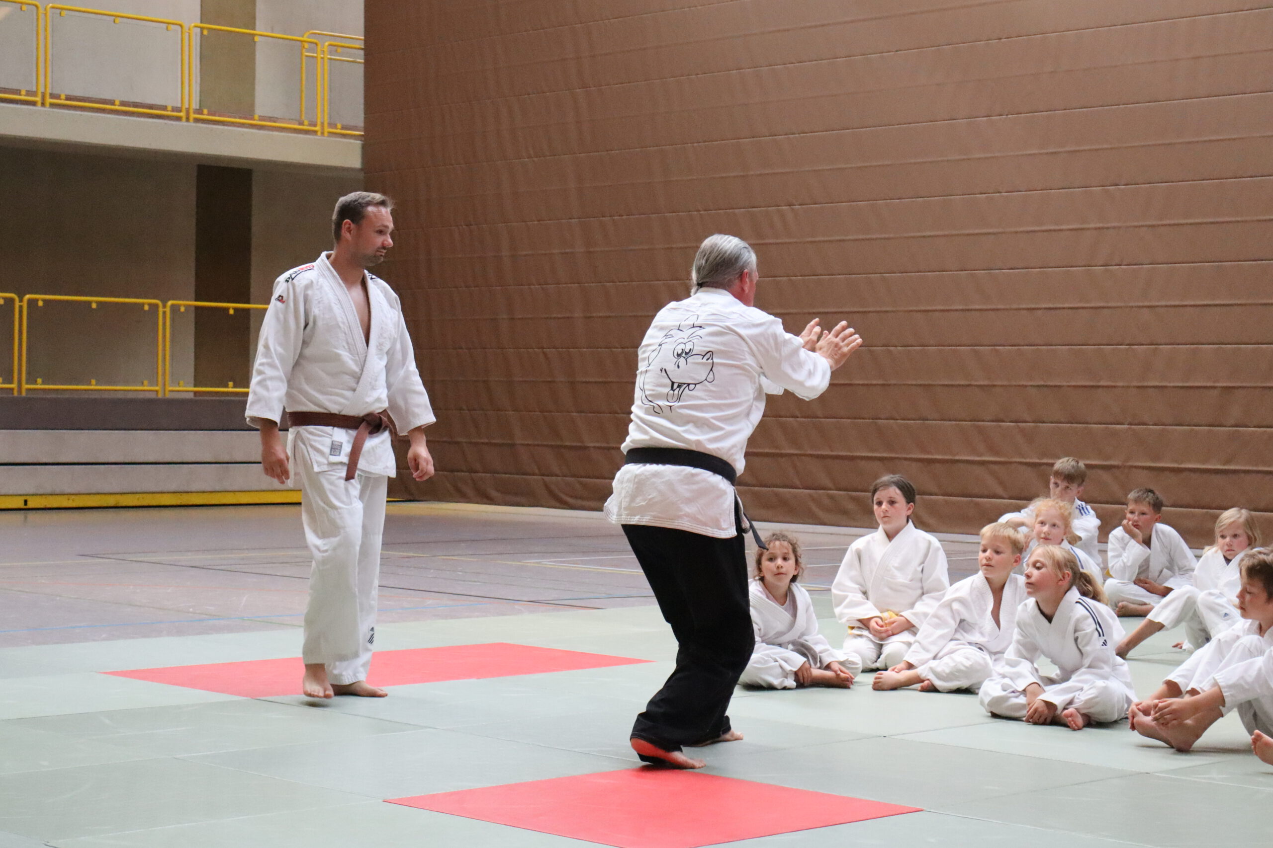Und da Andreas Dern schon mal da war, kamen auch gleich die Kinder und Jugendlichen in den Genuss, einmal einen anderen, erfahrenen Jugendtrainer live auf der Matte zu erleben. Mit viel Witz brachte er seine Begeisterung für den JuJutsu-Sport an die jungen Sportlerinnen und Sportler. Diese dankten es ihm mit viel Fleiß und leuchtenden Kinderaugen. Mit Bildern vermochte es Andreas den Kindern beizubringen, sich wie ein Superheld zu verteidigen. So lernten sie die Verteidigungstechniken der Superhelden von Hello Kitty bis zum Hulk.