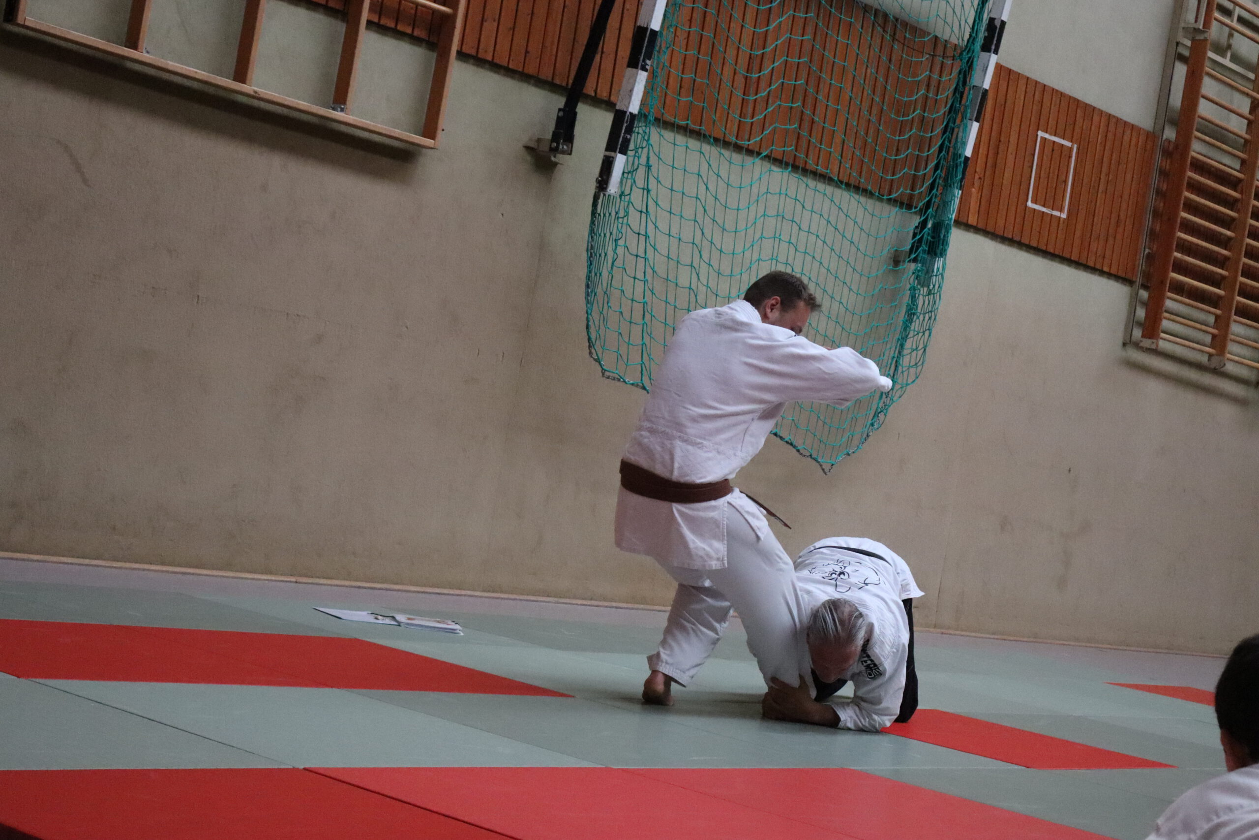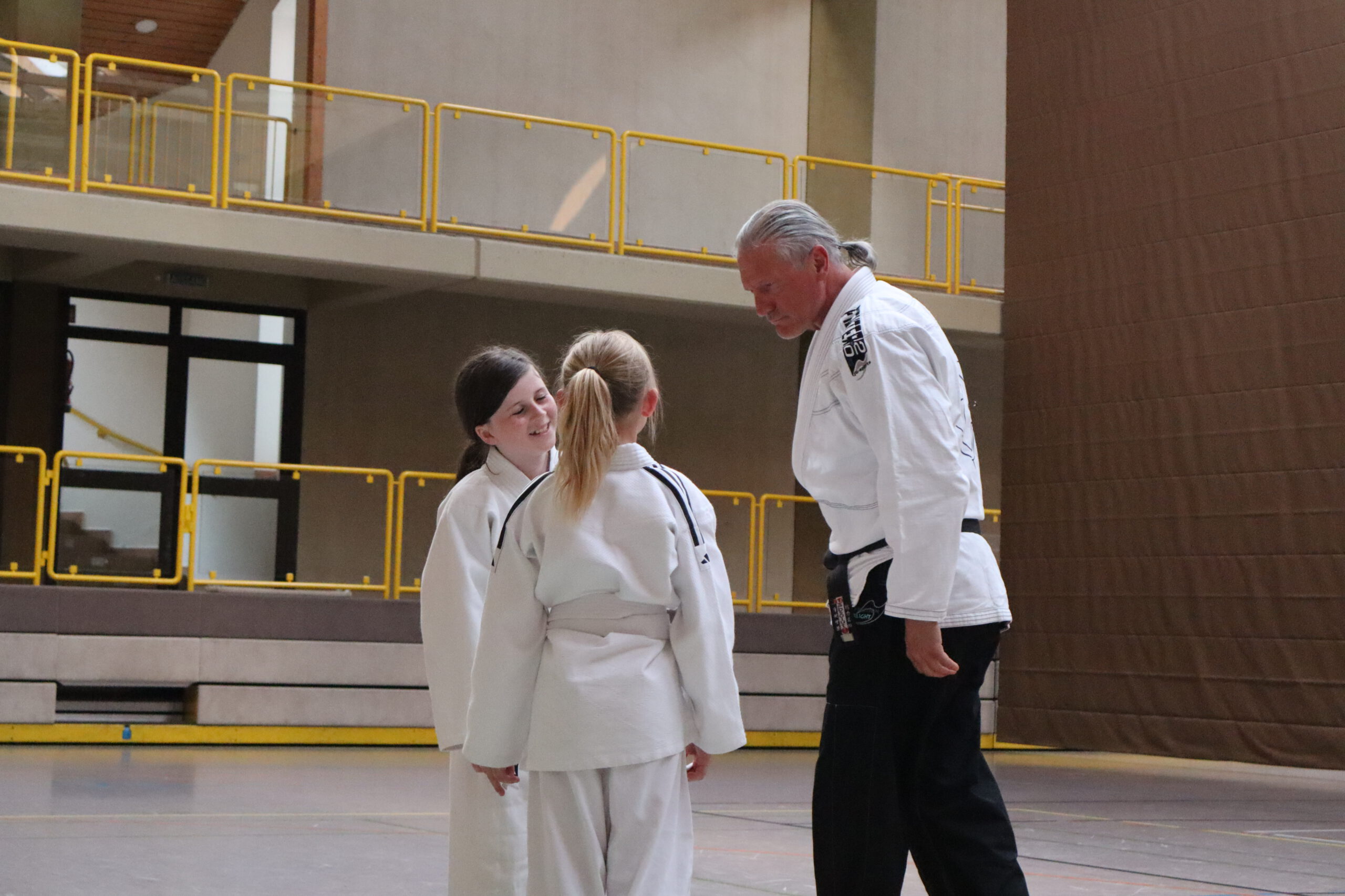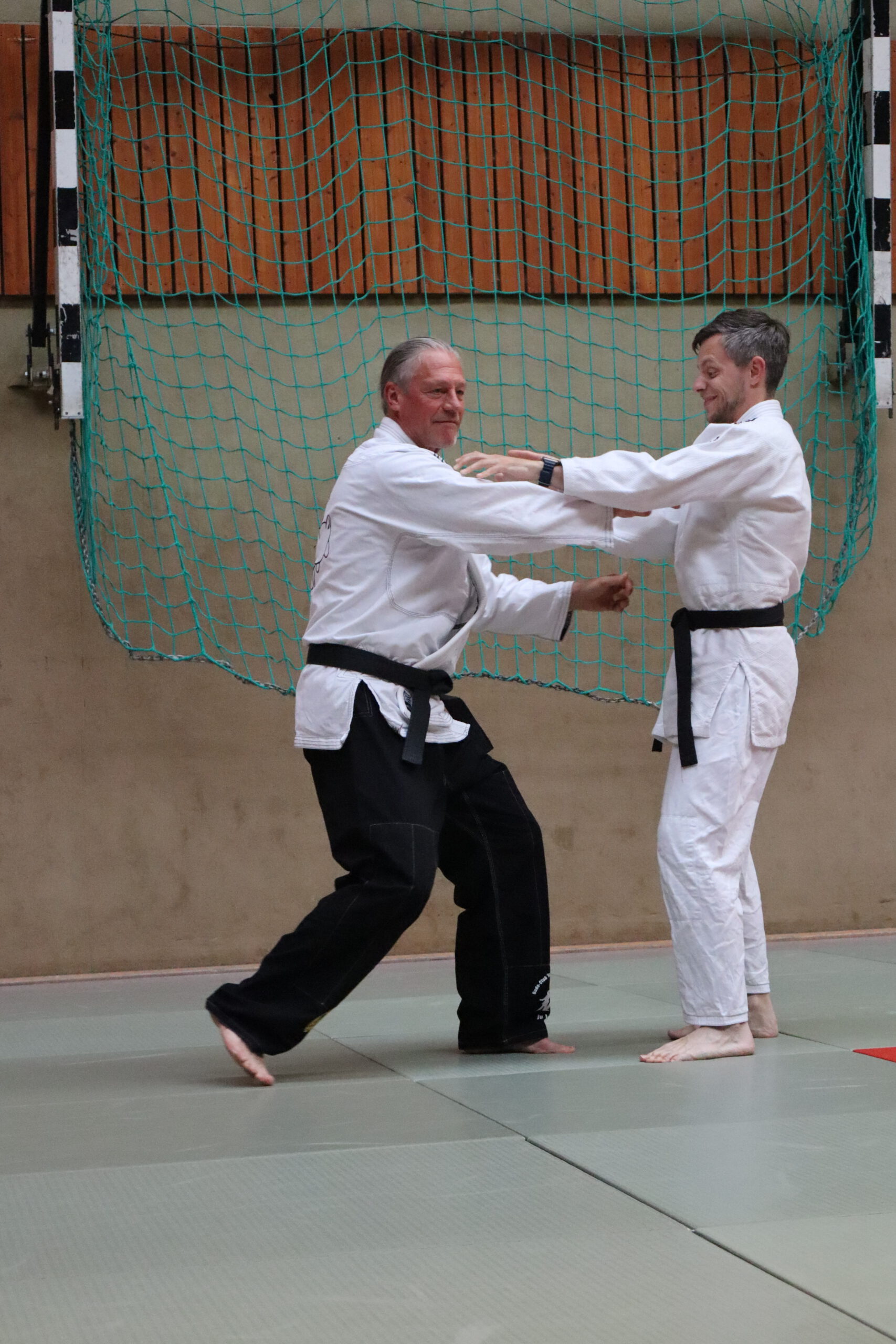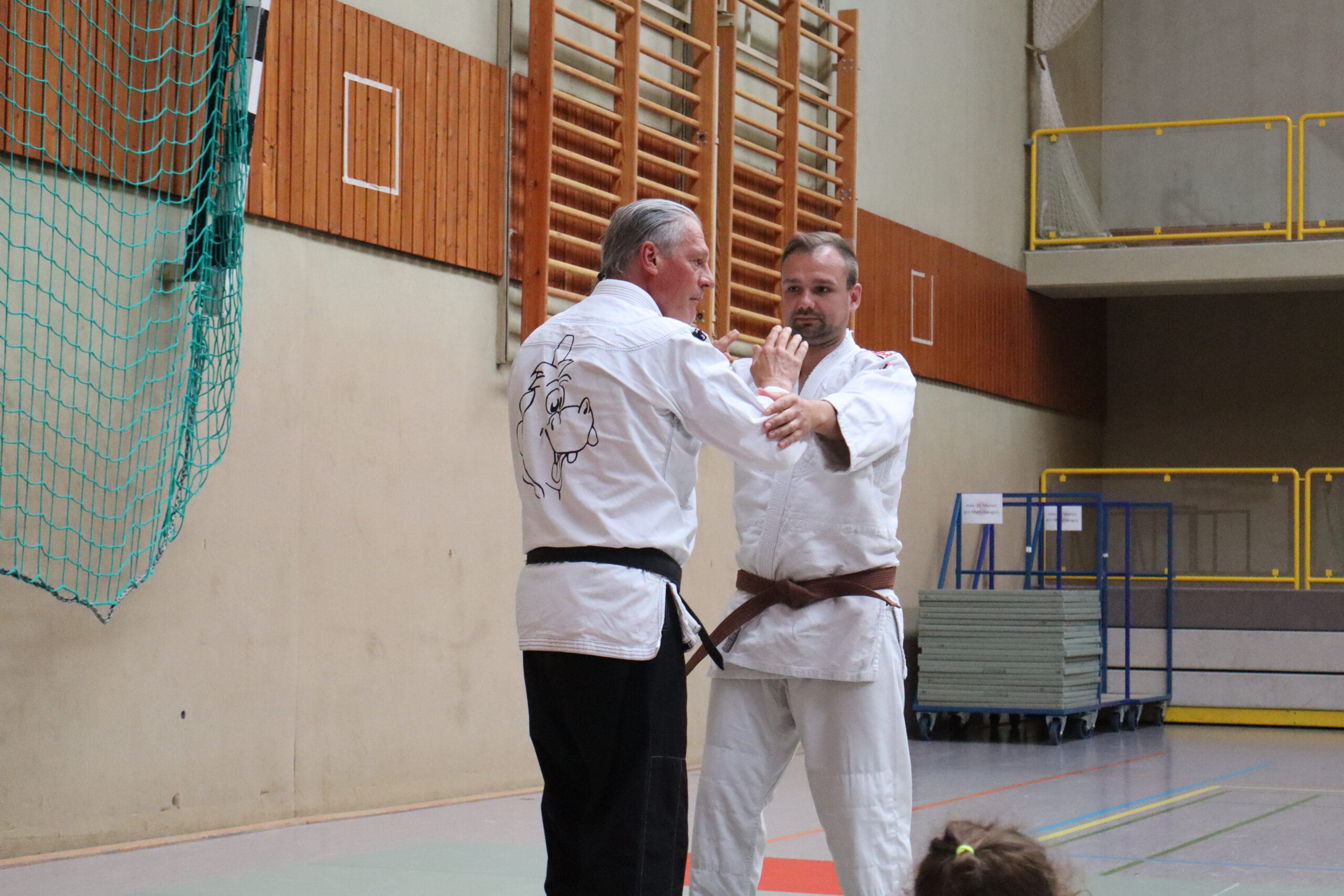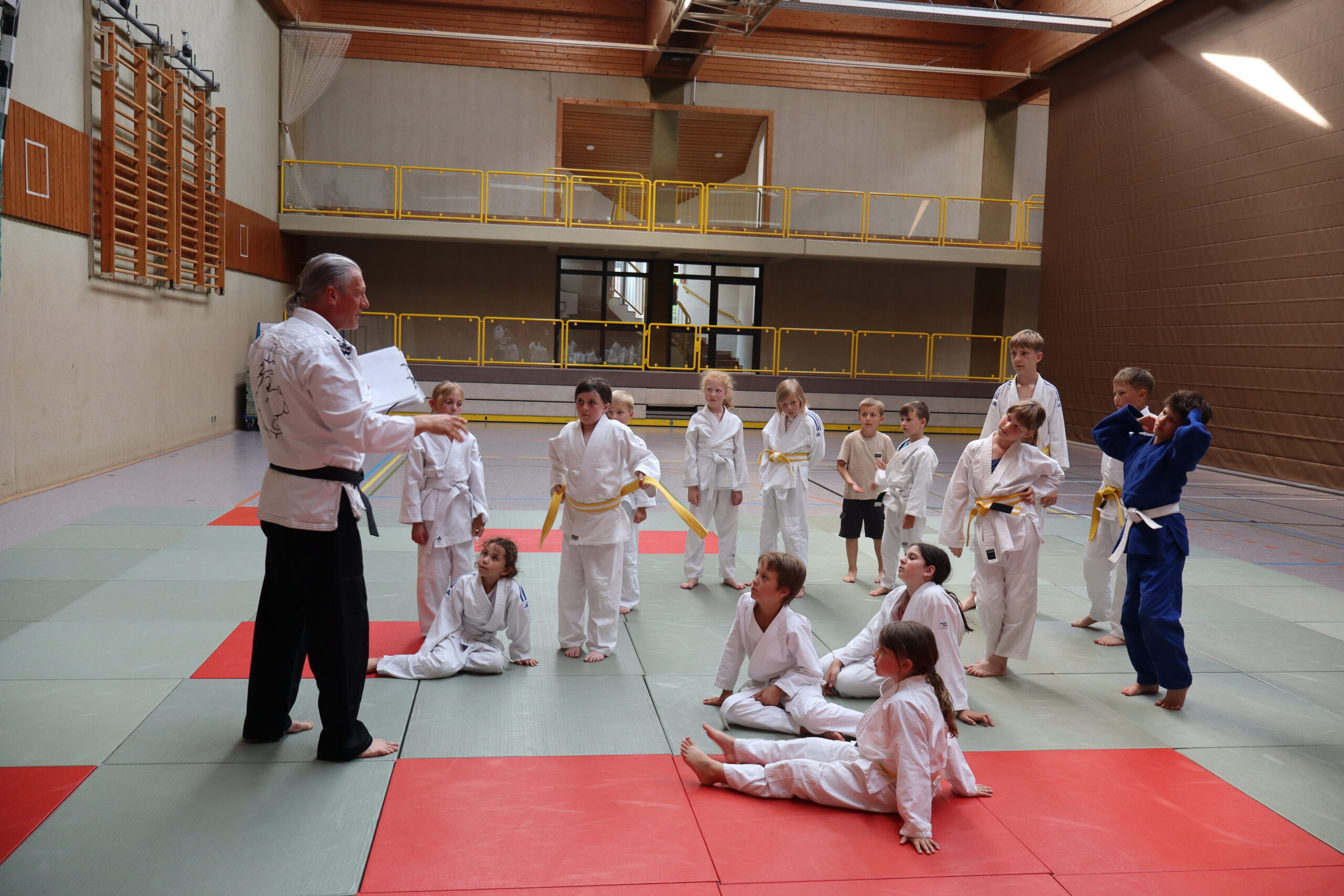 Und da Andreas Dern schon mal da war, kamen auch gleich die Kinder und Jugendlichen in den Genuss, einmal einen anderen, erfahrenen Jugendtrainer live auf der Matte zu erleben. Mit viel Witz brachte er seine Begeisterung für den JuJutsu-Sport an die jungen Sportlerinnen und Sportler. Diese dankten es ihm mit viel Fleiß und leuchtenden Kinderaugen. Mit Bildern vermochte es Andreas den Kindern beizubringen, sich wie ein Superheld zu verteidigen. So lernten sie die Verteidigungstechniken der Superhelden von Hello Kitty bis zum Hulk.