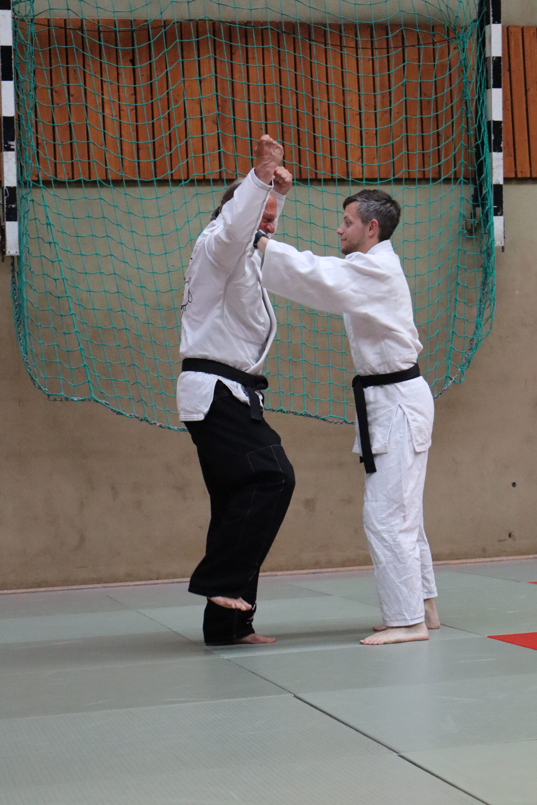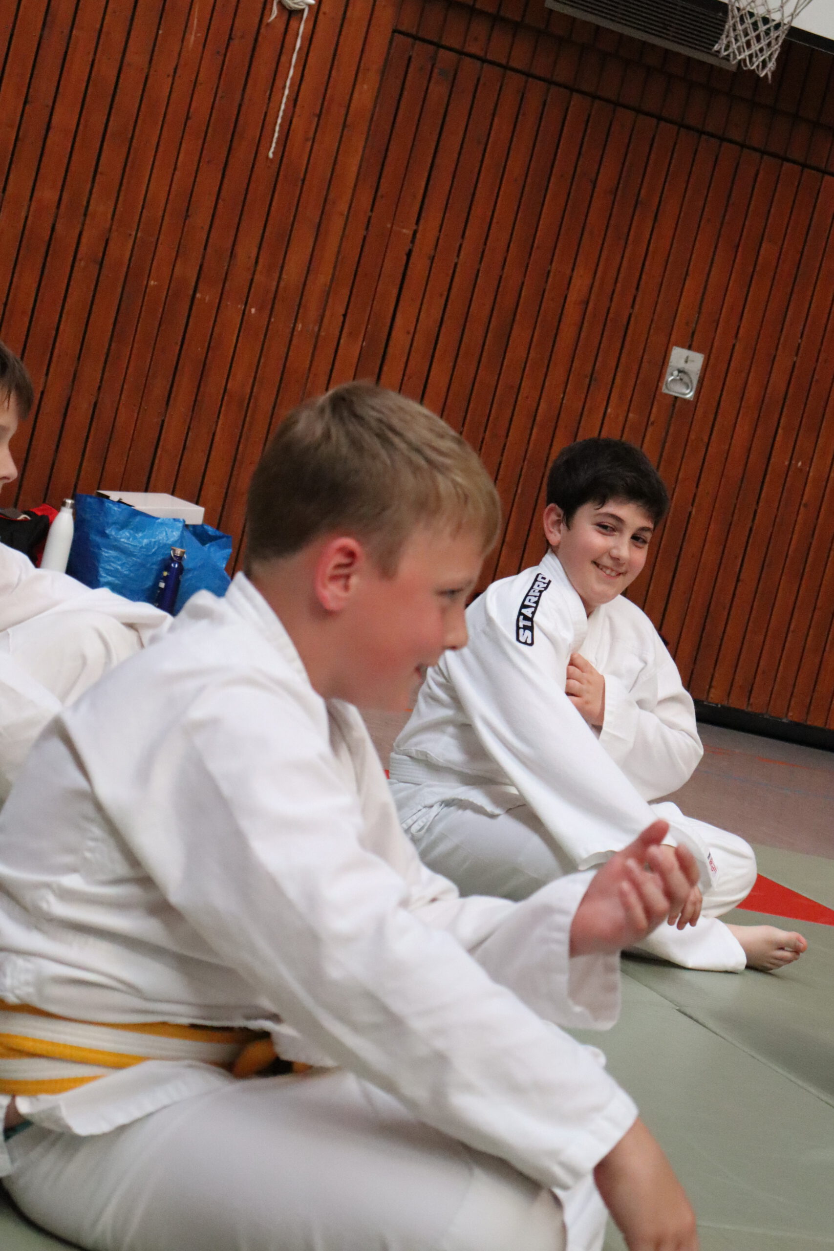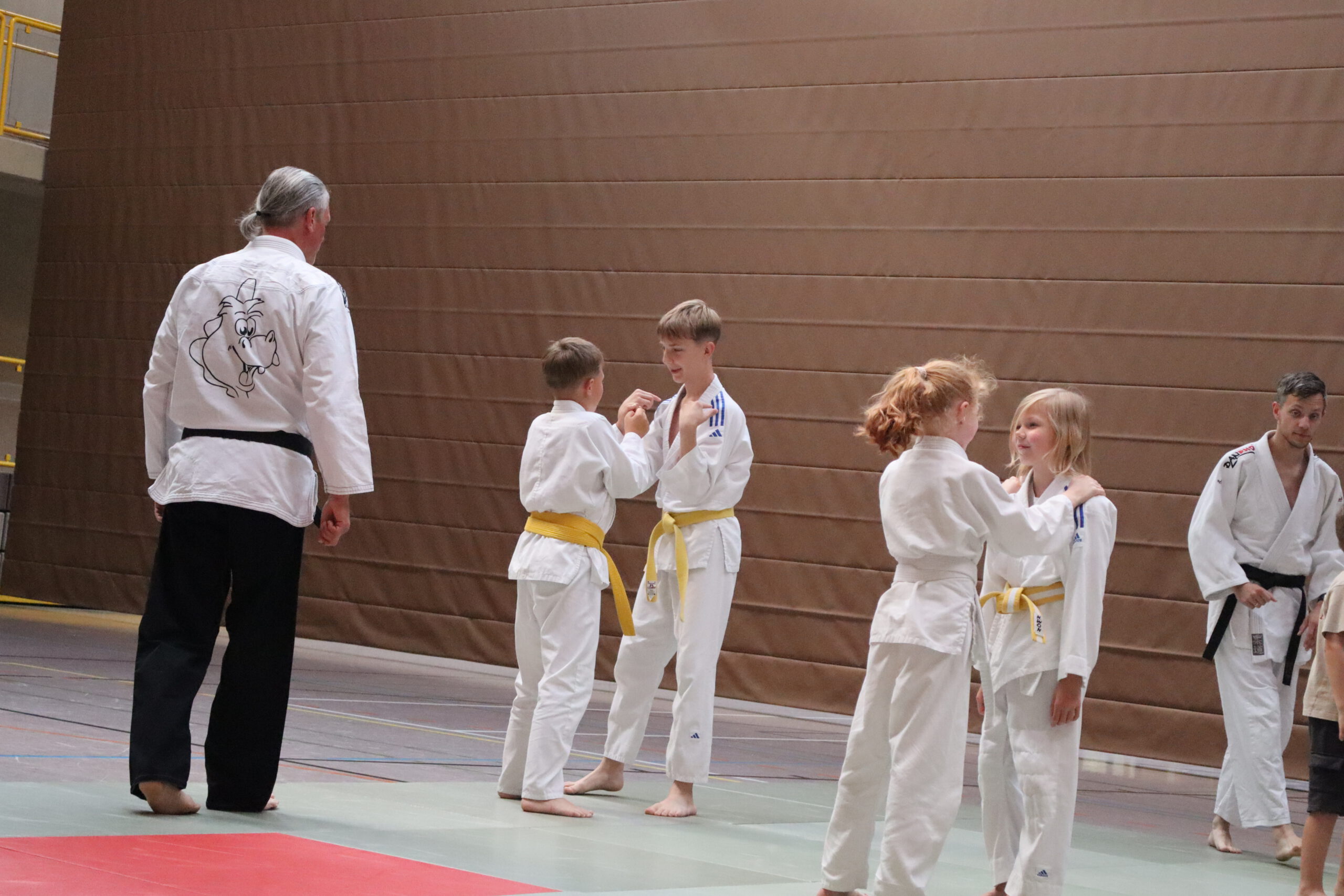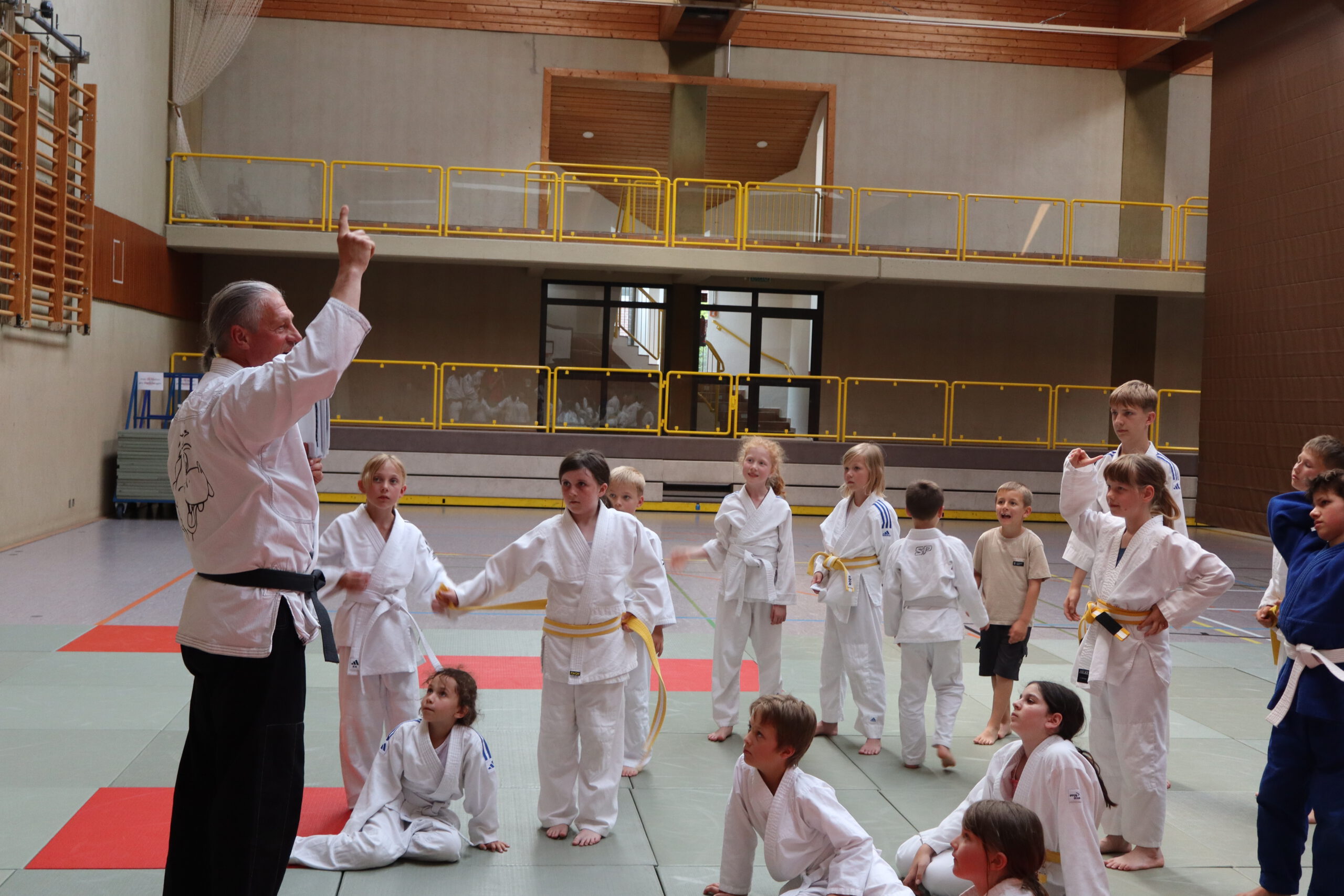 Und da Andreas Dern schon mal da war, kamen auch gleich die Kinder und Jugendlichen in den Genuss, einmal einen anderen, erfahrenen Jugendtrainer live auf der Matte zu erleben. Mit viel Witz brachte er seine Begeisterung für den JuJutsu-Sport an die jungen Sportlerinnen und Sportler. Diese dankten es ihm mit viel Fleiß und leuchtenden Kinderaugen. Mit Bildern vermochte es Andreas den Kindern beizubringen, sich wie ein Superheld zu verteidigen. So lernten sie die Verteidigungstechniken der Superhelden von Hello Kitty bis zum Hulk.