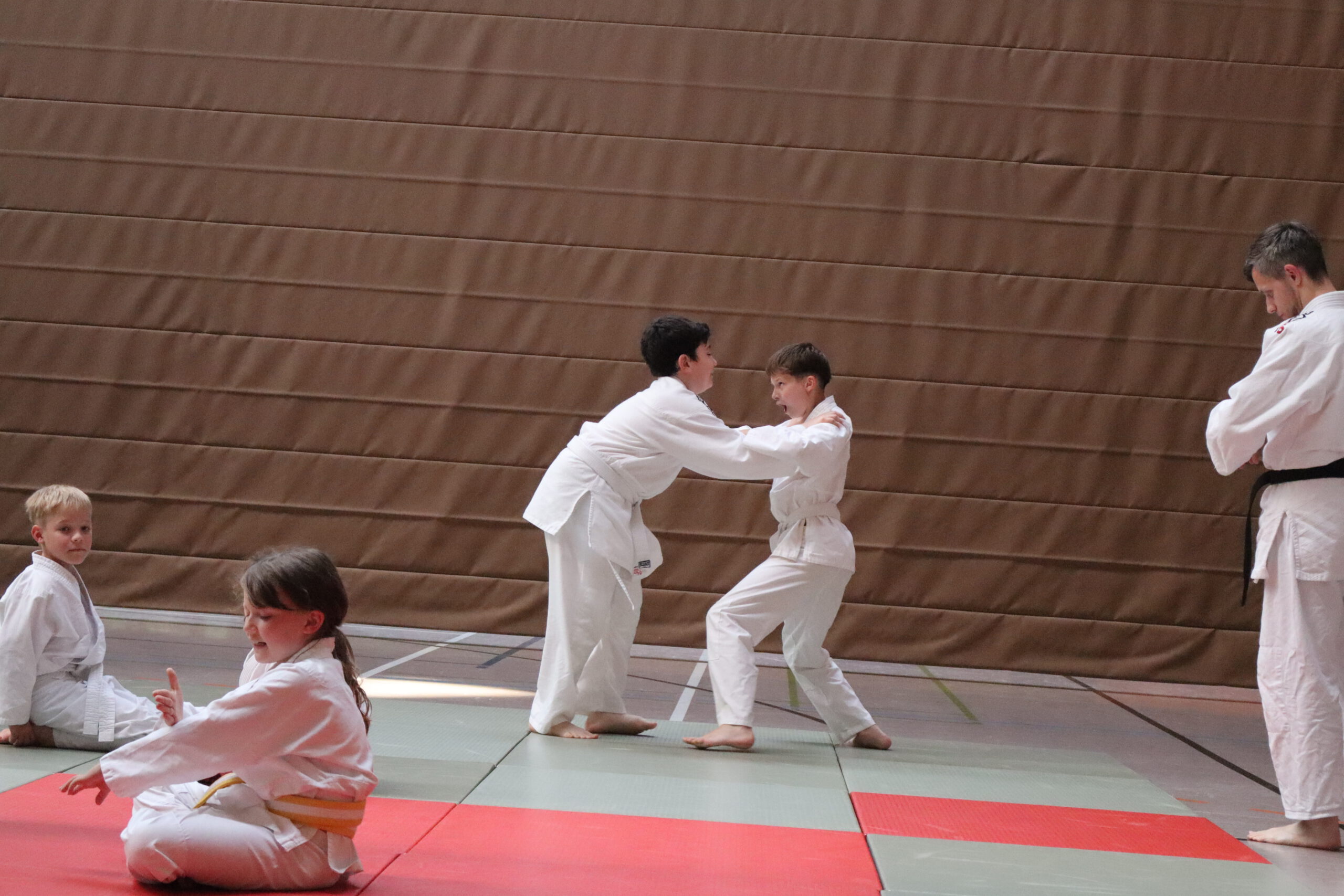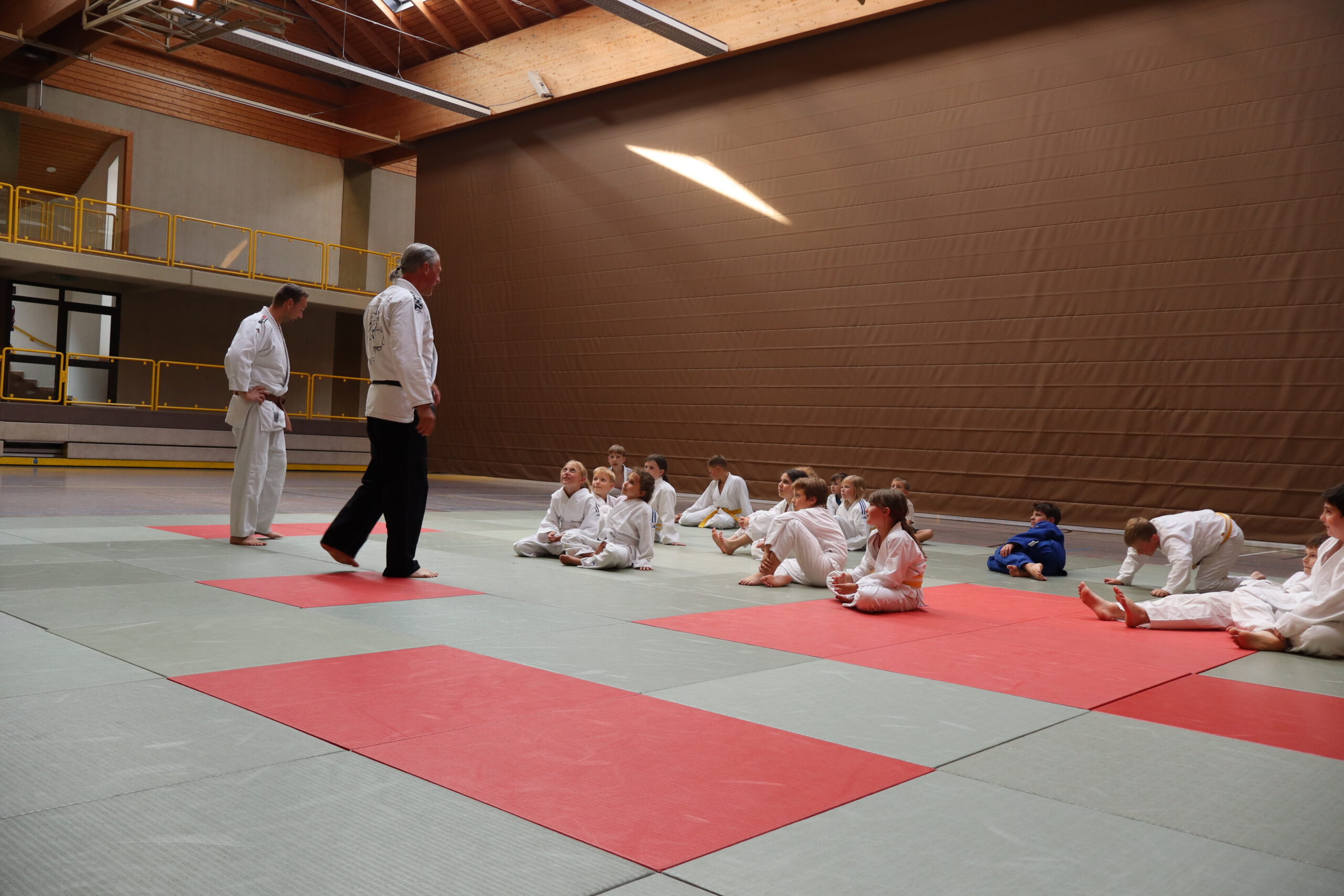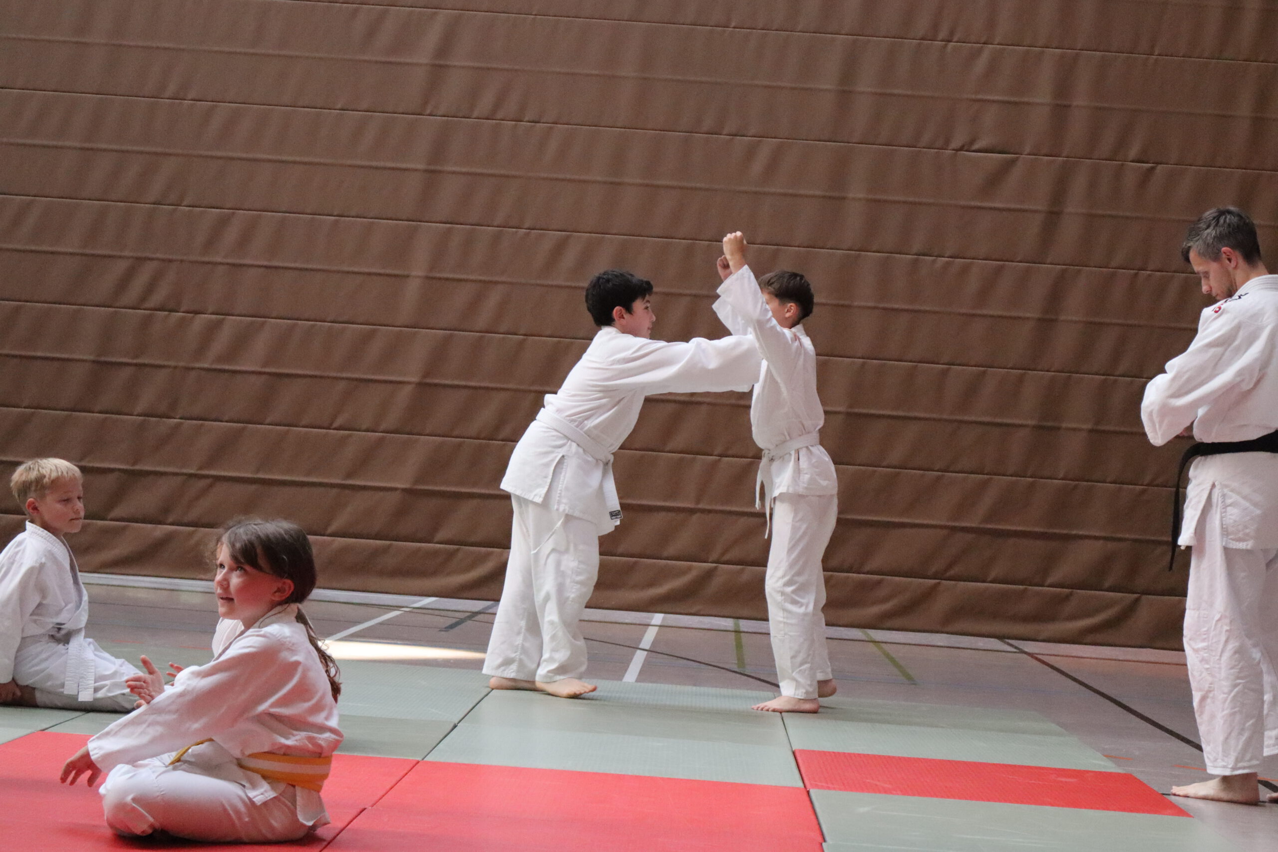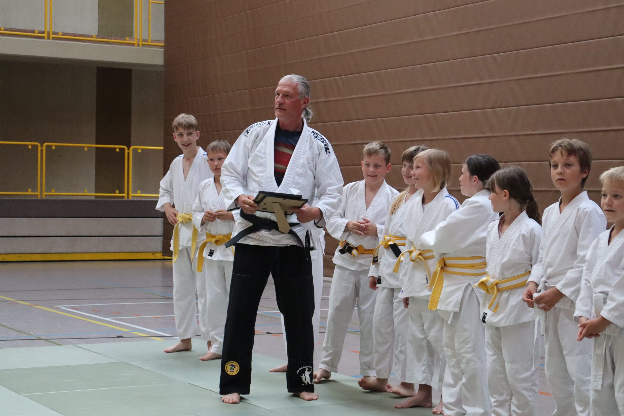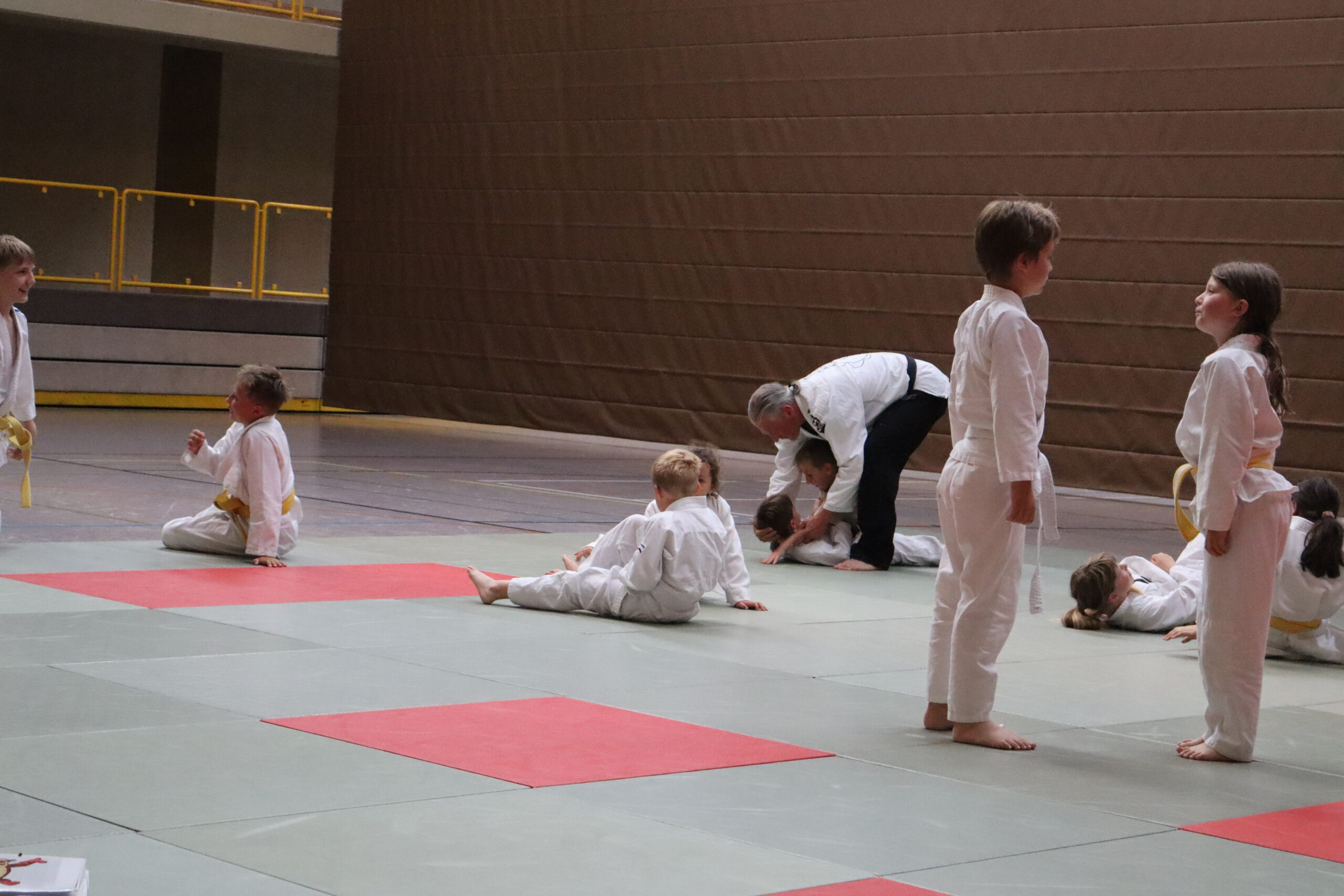 Und da Andreas Dern schon mal da war, kamen auch gleich die Kinder und Jugendlichen in den Genuss, einmal einen anderen, erfahrenen Jugendtrainer live auf der Matte zu erleben. Mit viel Witz brachte er seine Begeisterung für den JuJutsu-Sport an die jungen Sportlerinnen und Sportler. Diese dankten es ihm mit viel Fleiß und leuchtenden Kinderaugen. Mit Bildern vermochte es Andreas den Kindern beizubringen, sich wie ein Superheld zu verteidigen. So lernten sie die Verteidigungstechniken der Superhelden von Hello Kitty bis zum Hulk.