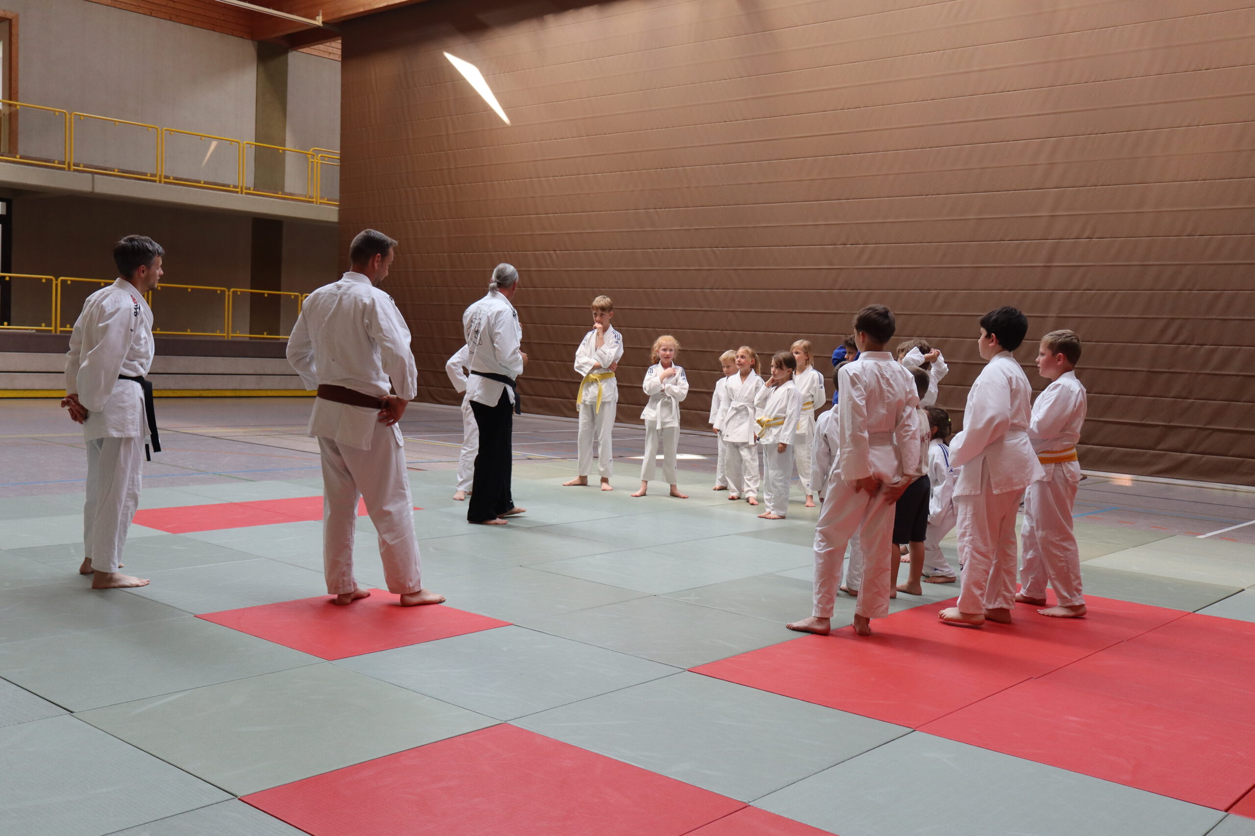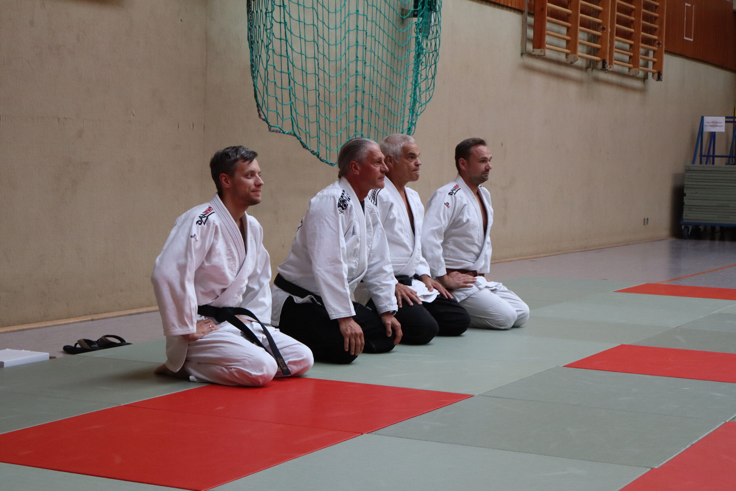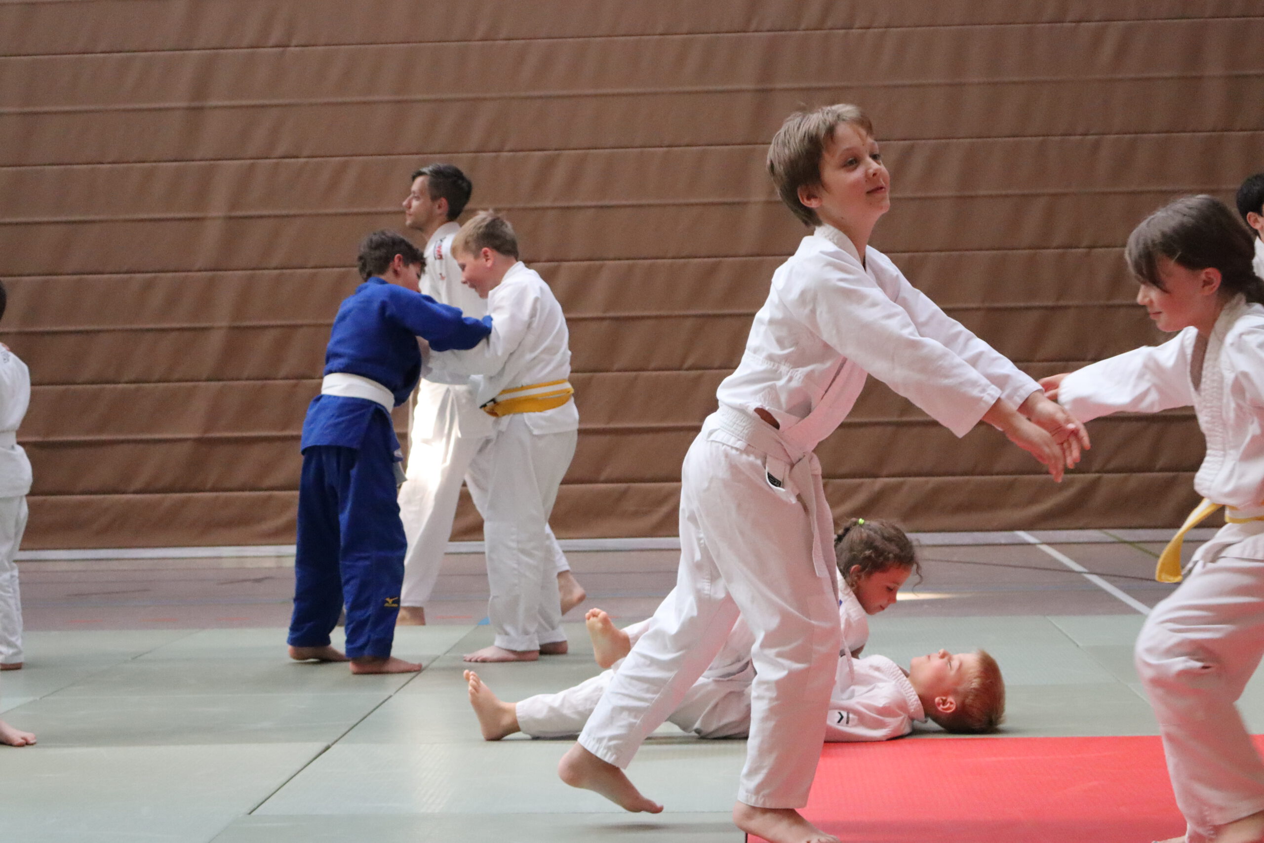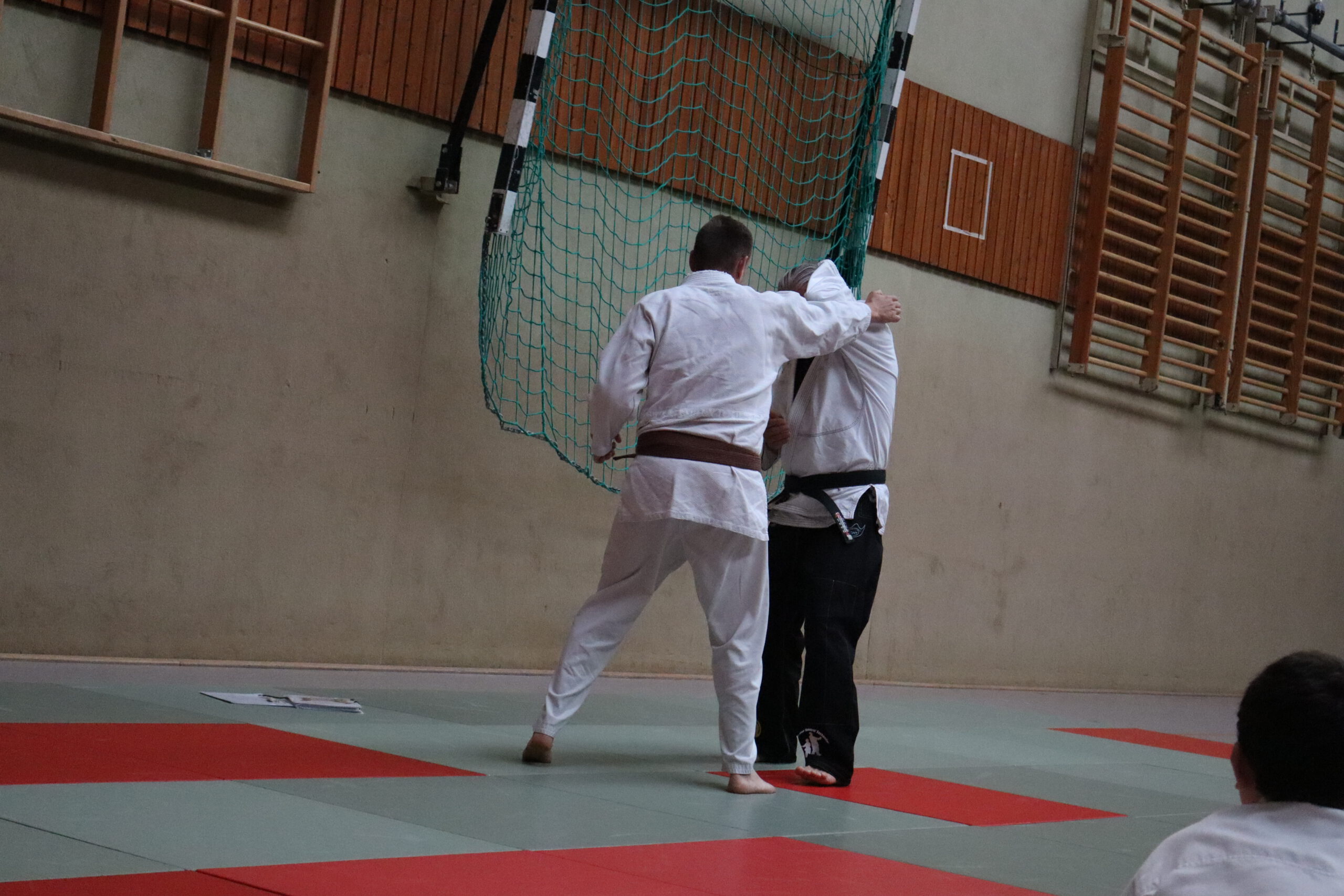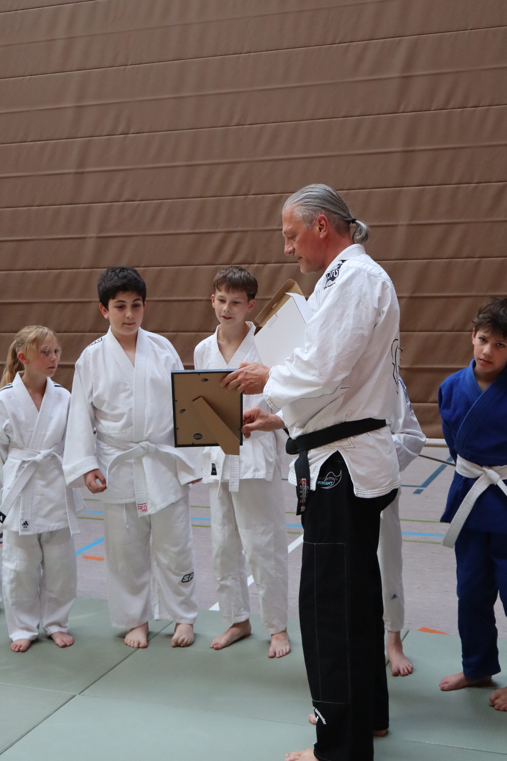 Und da Andreas Dern schon mal da war, kamen auch gleich die Kinder und Jugendlichen in den Genuss, einmal einen anderen, erfahrenen Jugendtrainer live auf der Matte zu erleben. Mit viel Witz brachte er seine Begeisterung für den JuJutsu-Sport an die jungen Sportlerinnen und Sportler. Diese dankten es ihm mit viel Fleiß und leuchtenden Kinderaugen. Mit Bildern vermochte es Andreas den Kindern beizubringen, sich wie ein Superheld zu verteidigen. So lernten sie die Verteidigungstechniken der Superhelden von Hello Kitty bis zum Hulk.