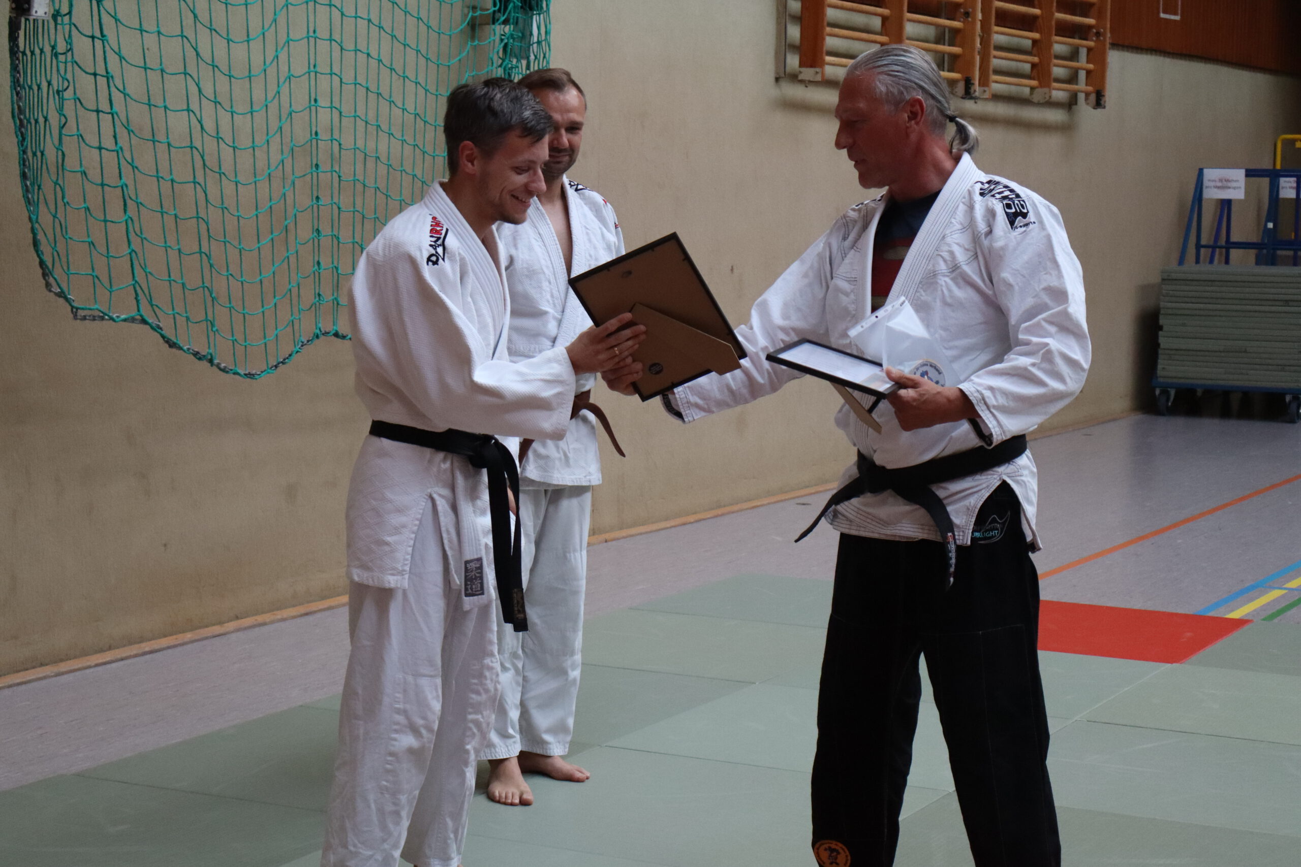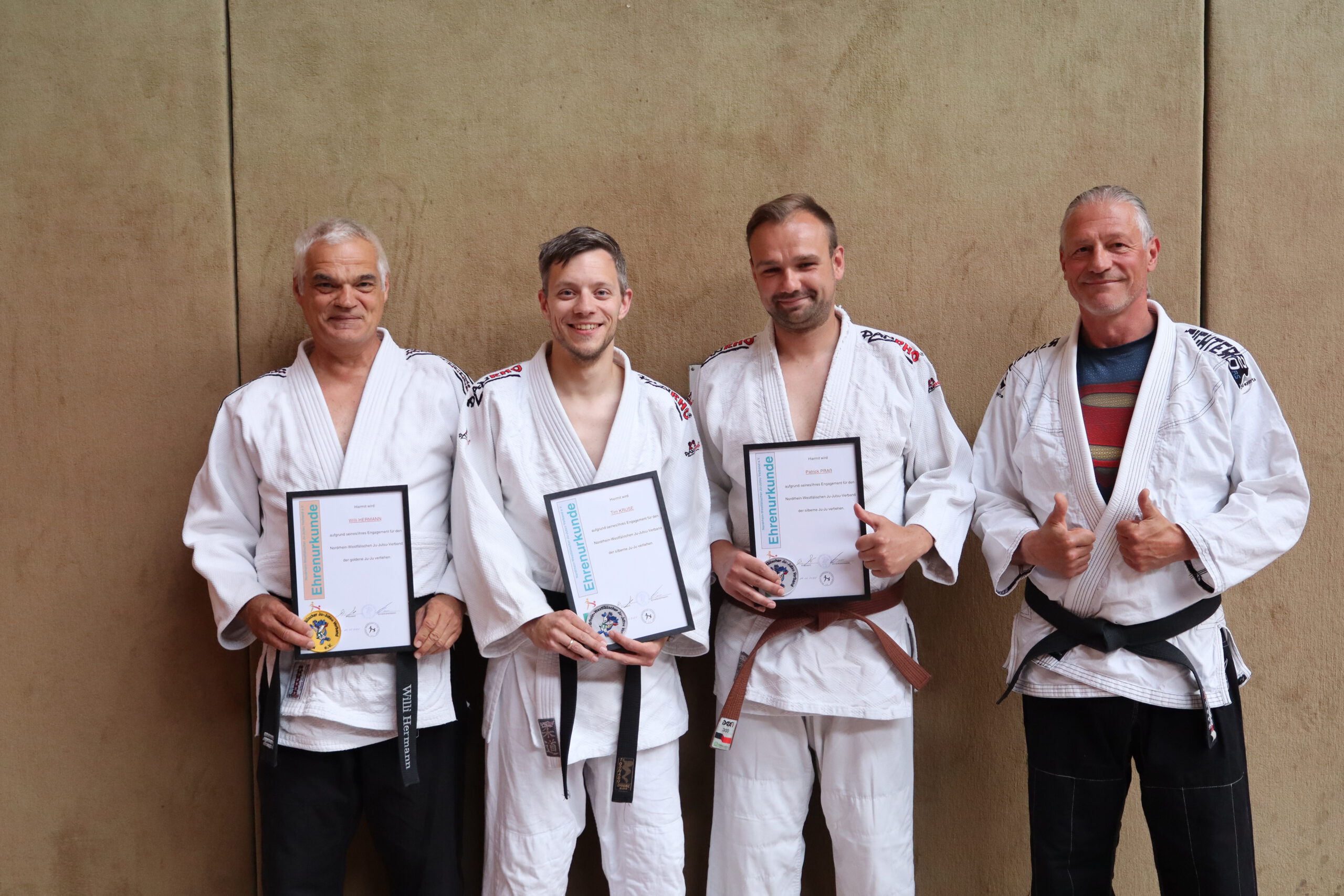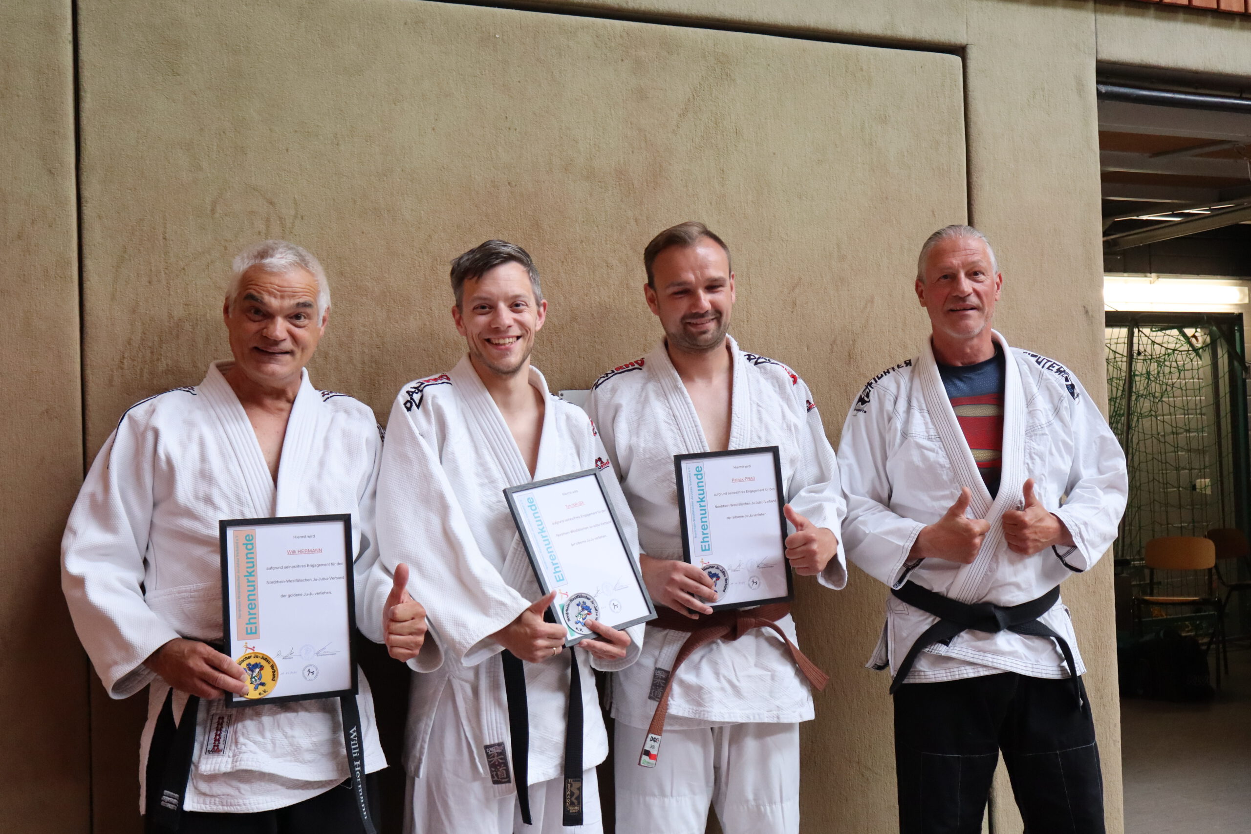 Ehre wem Ehre gebührt! Extra aus Aachen reiste am Mittwoch der Vize-Präsident Jugend, Andreas Dern, des Nordrhein-Westfälischen-JuJutsu-Verbandes an, um langjährige und engagierte Übungsleiter für ihre vorbildliche Arbeit auszuzeichnen. Für 10-jähriges Engagements in der Jugendarbeit wurden mit dem silbernen JuJu Tim Kruse und Patrick Praß ausgezeichnet. Über den goldenen JuJu durfte sich Willi Hermann freuen, er ist seit über 15 Jahren in der Jugendarbeit des Judo-Club-Velen-Reken tätig.
