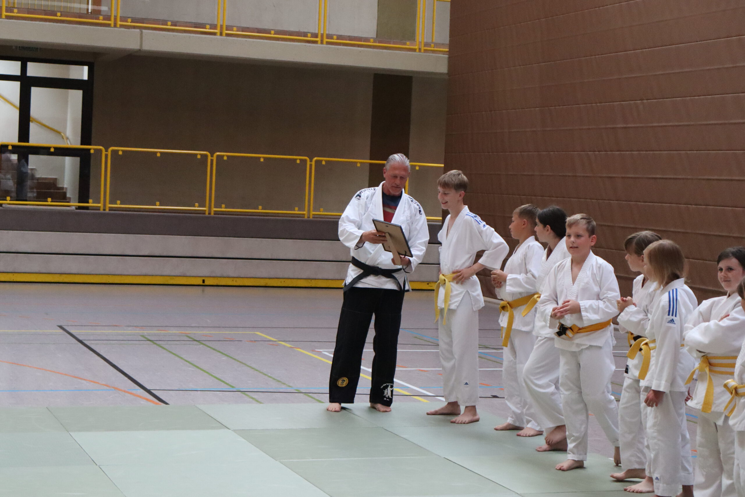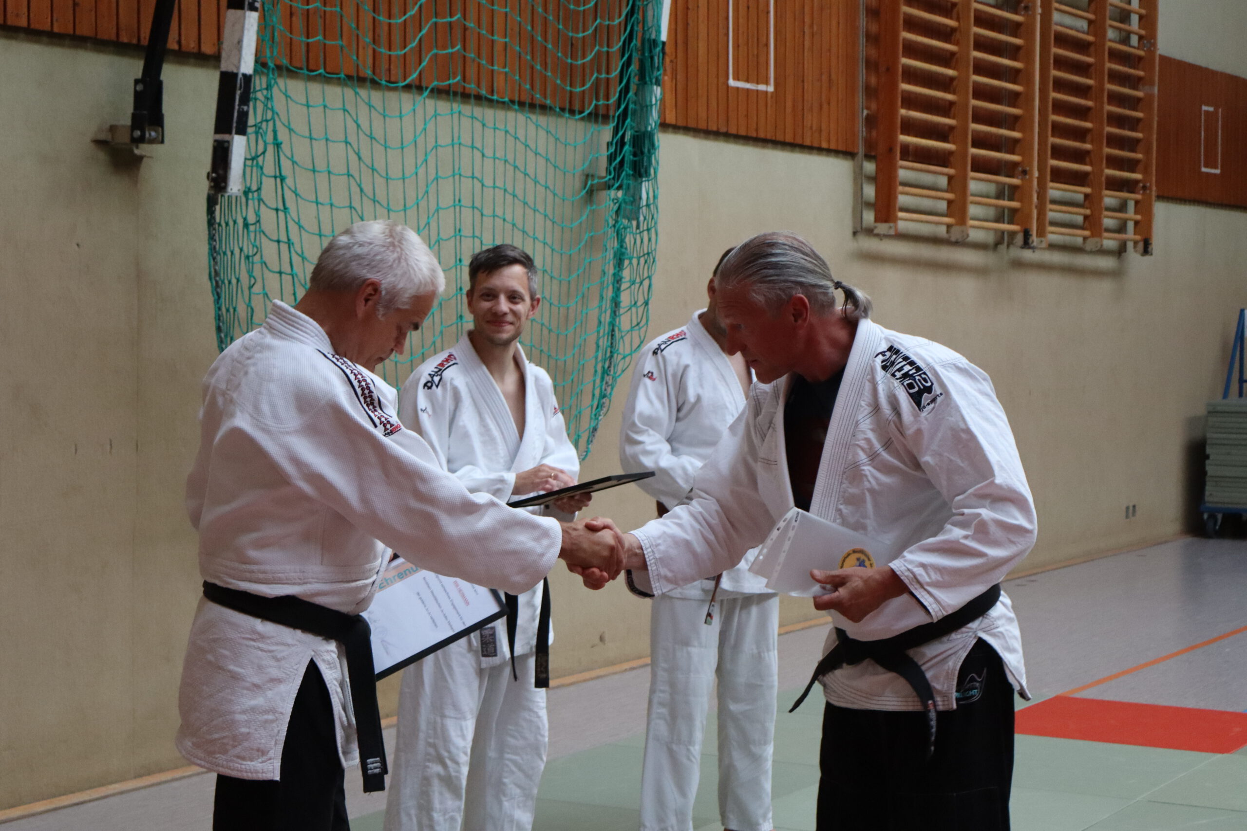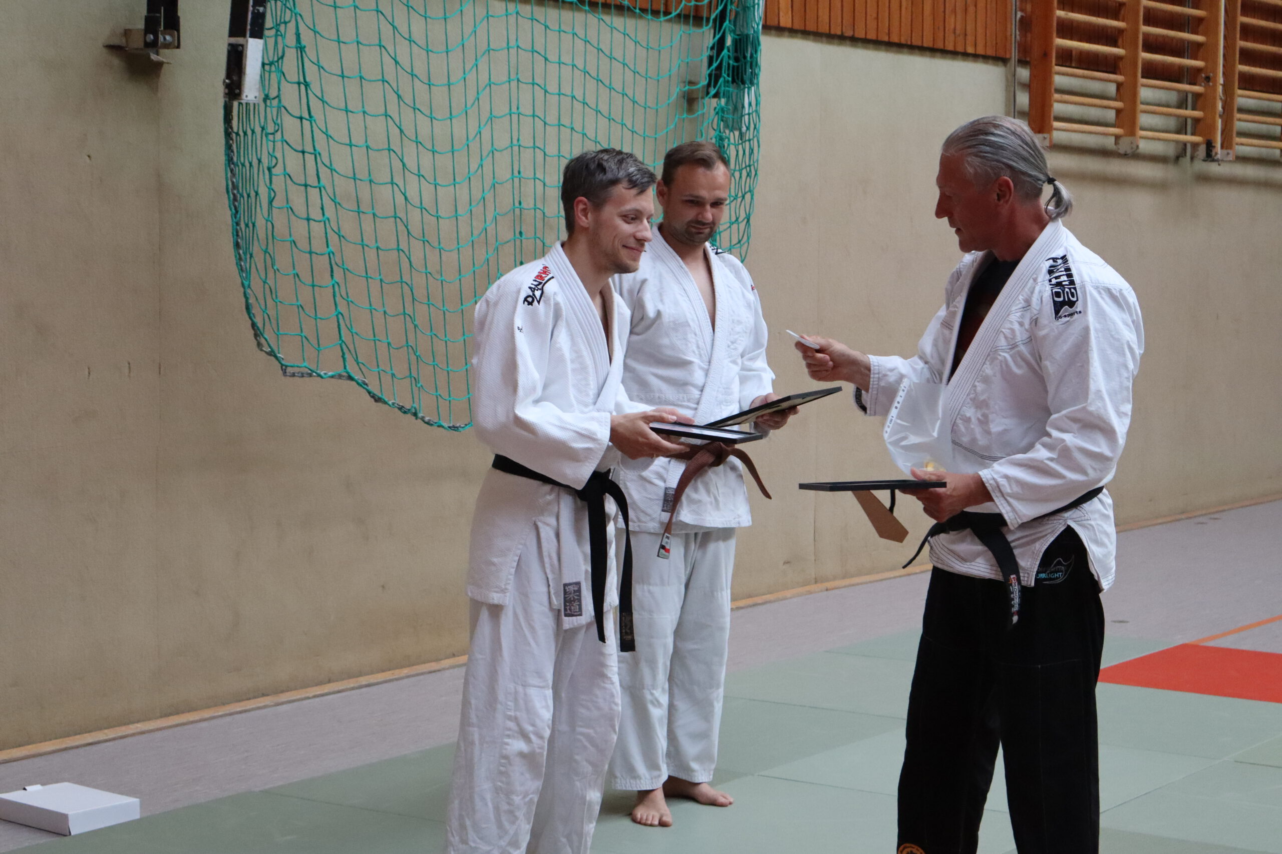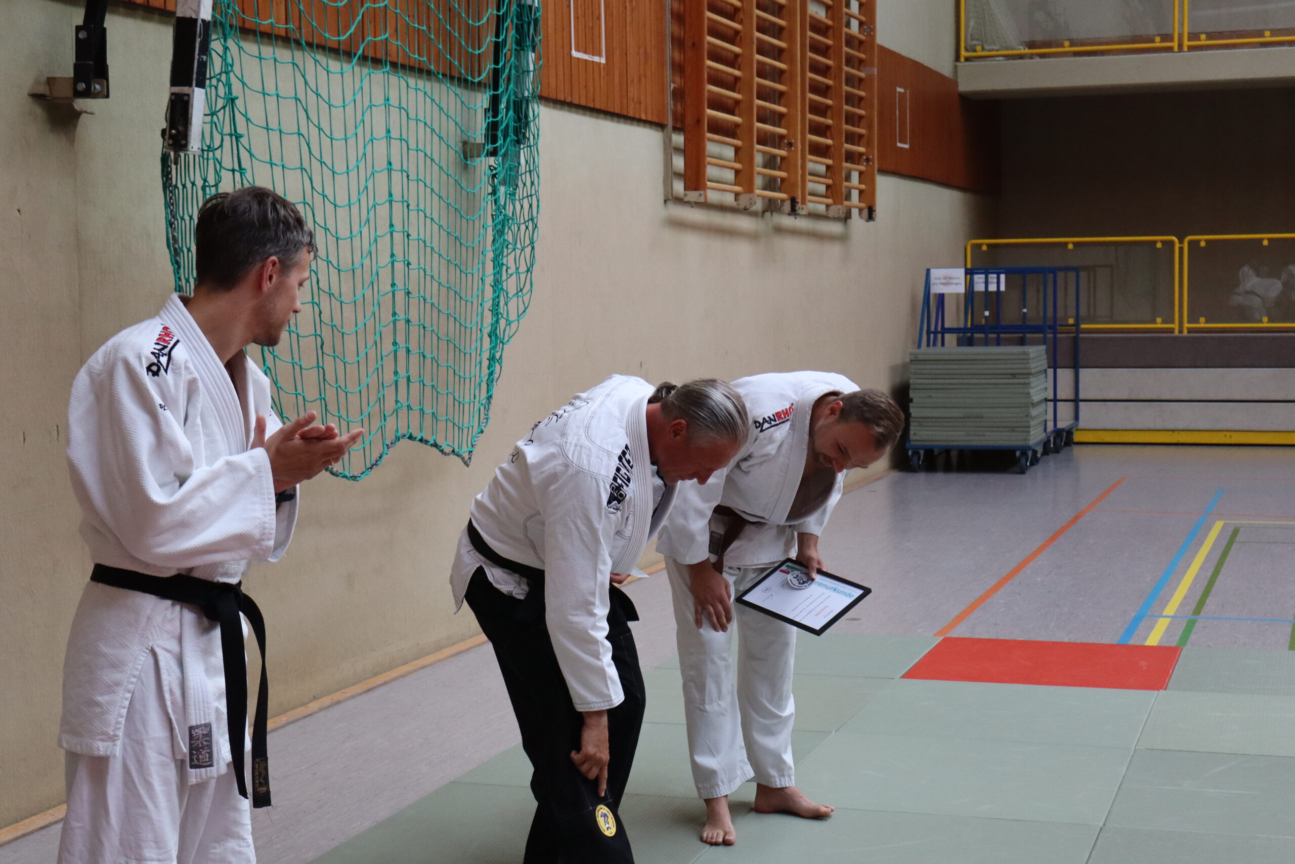 Ehre wem Ehre gebührt! Extra aus Aachen reiste am Mittwoch der Vize-Präsident Jugend, Andreas Dern, des Nordrhein-Westfälischen-JuJutsu-Verbandes an, um langjährige und engagierte Übungsleiter für ihre vorbildliche Arbeit auszuzeichnen. Für 10-jähriges Engagements in der Jugendarbeit wurden mit dem silbernen JuJu Tim Kruse und Patrick Praß ausgezeichnet. Über den goldenen JuJu durfte sich Willi Hermann freuen, er ist seit über 15 Jahren in der Jugendarbeit des Judo-Club-Velen-Reken tätig.